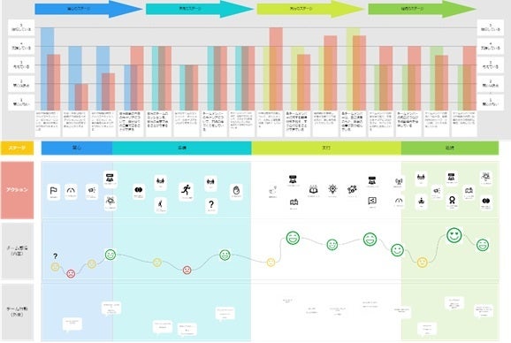 アセスメント:「関心」「準備」「実行」「継続」の4つフェーズでミッションと業務やキャリアとのつながり、メンバーとの関わり、学びや成長についての16項目の設問でスコアがグラフで表示される。ワークショップ前後での比較が可能/チーム・ジャーニー:アセスメントの結果から数値が低い項目への取るべきアクションとそれによるチームの感情と行動の変化が可視化される。