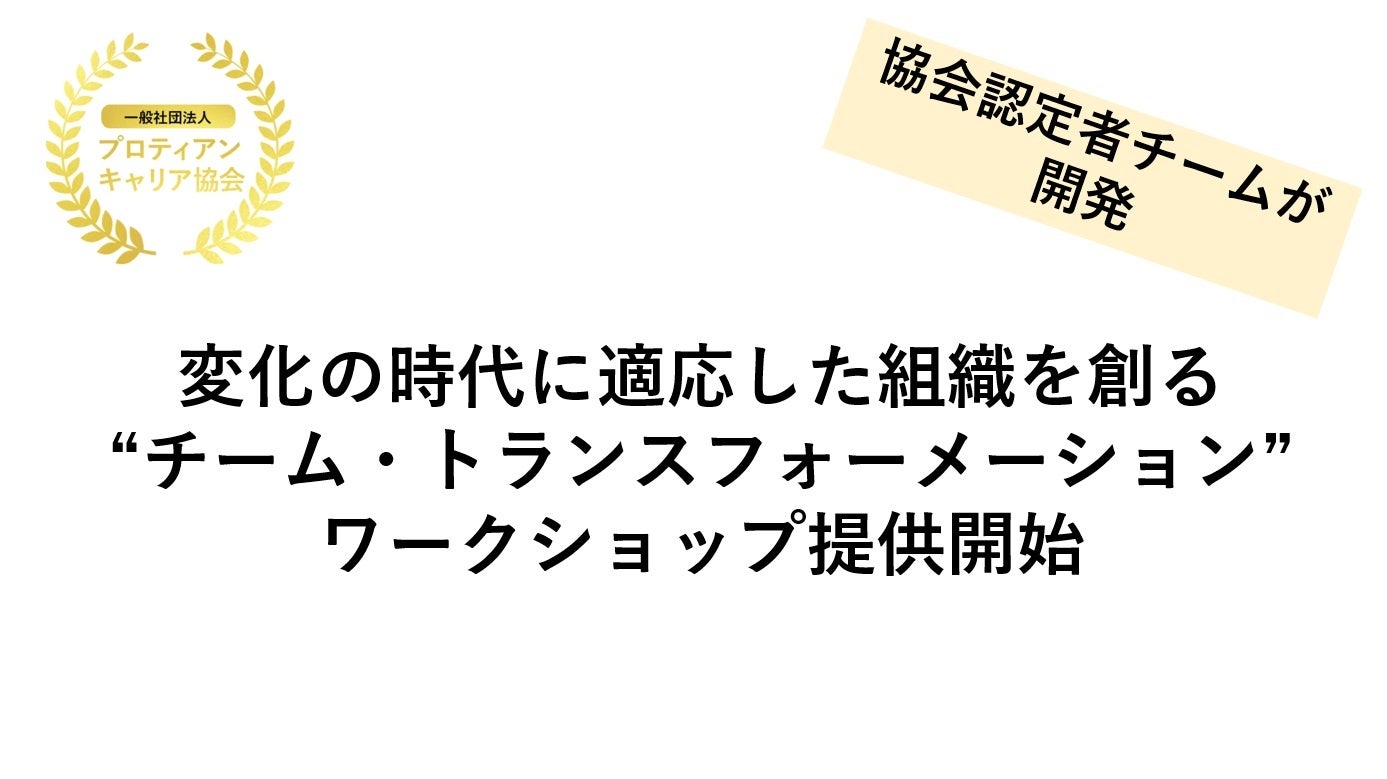 組織と個人のより良き関係性構築と個人の主体的なキャリア開発を支援する一般社団法人プロティアン・キャリア協会 (東京都新宿区、代表理事:田中研之輔・有山徹、以下、「当協会」)は、管理職のキャリア支援力を強化し、チーム変化適応力とエンゲージメントの向上を可能にする「チームトランスフォーメーション・ワークショップ」を今月より提供開始致します。
