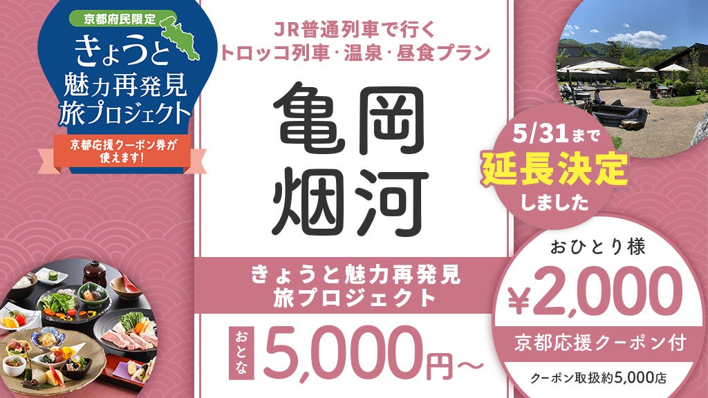 【5月31日迄延長!京都府民限定!】これだけ付いて5,000円‼️さらに2,000円クーポン付往復JR乗車券付!嵐山・トロッコ列車・創作会席ランチ&湯の花温泉 日帰りプラン