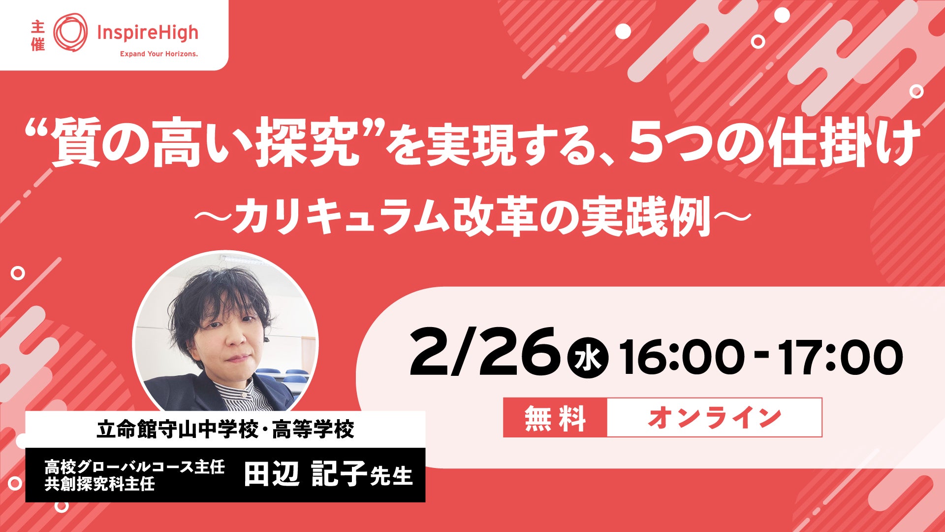 「世界とつながる探究的な学びを手軽に教室で」をコンセプトとしたEdTech教材を提供する、株式会社Inspire High(本社:東京都千代田区、代表:杉浦太一)は、探究学習の質を高めるヒントと実践例を紹介する、中高教員向けのオンラインセミナーを2/26(水)に開催します。