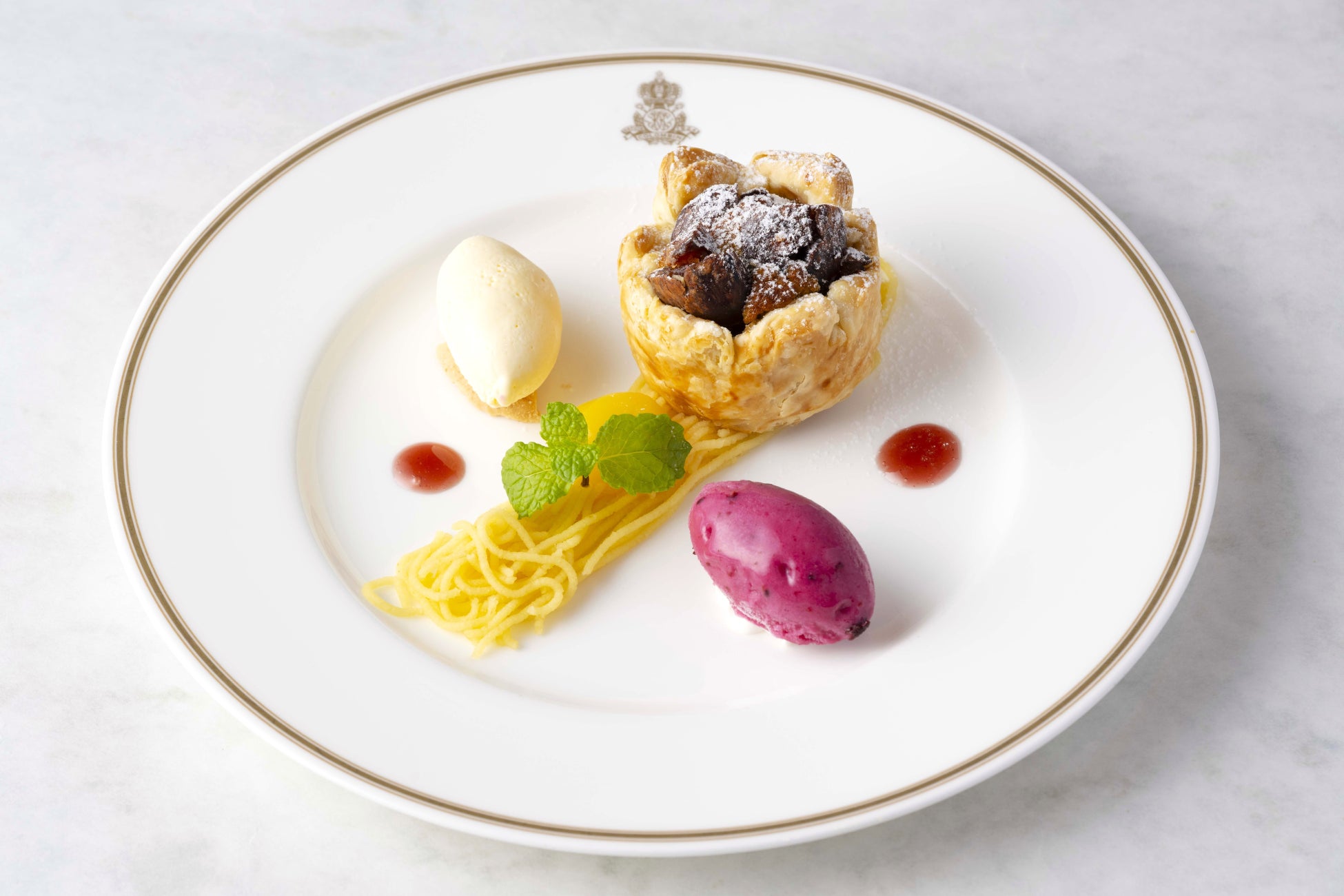 伝統のアイスモンブランクリームに高級栗の丹波栗と笠間栗を贅沢に使用し焼き上げたマロンパイです。大粒のごろっとした栗の食感と香りが、秋の深まりを感じさせます。サクサクの風味豊かなパイを温かいままお召し上がりください。ドリンクは、コーヒー、ニルギリ紅茶、ハーブティー3種からお選びいただけます。