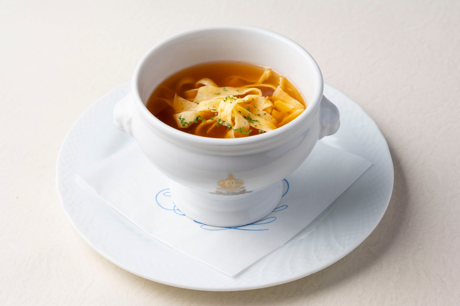 米粉のガレットをパスタのようにスープと一緒にいただくオーストリアの伝統的な料理です。ベースとなるスープには、海老名自社農園で収穫した無農薬の玉ねぎを使用しました。玉ねぎの持つ優しい甘みが引き立つ、心温まる一品です。