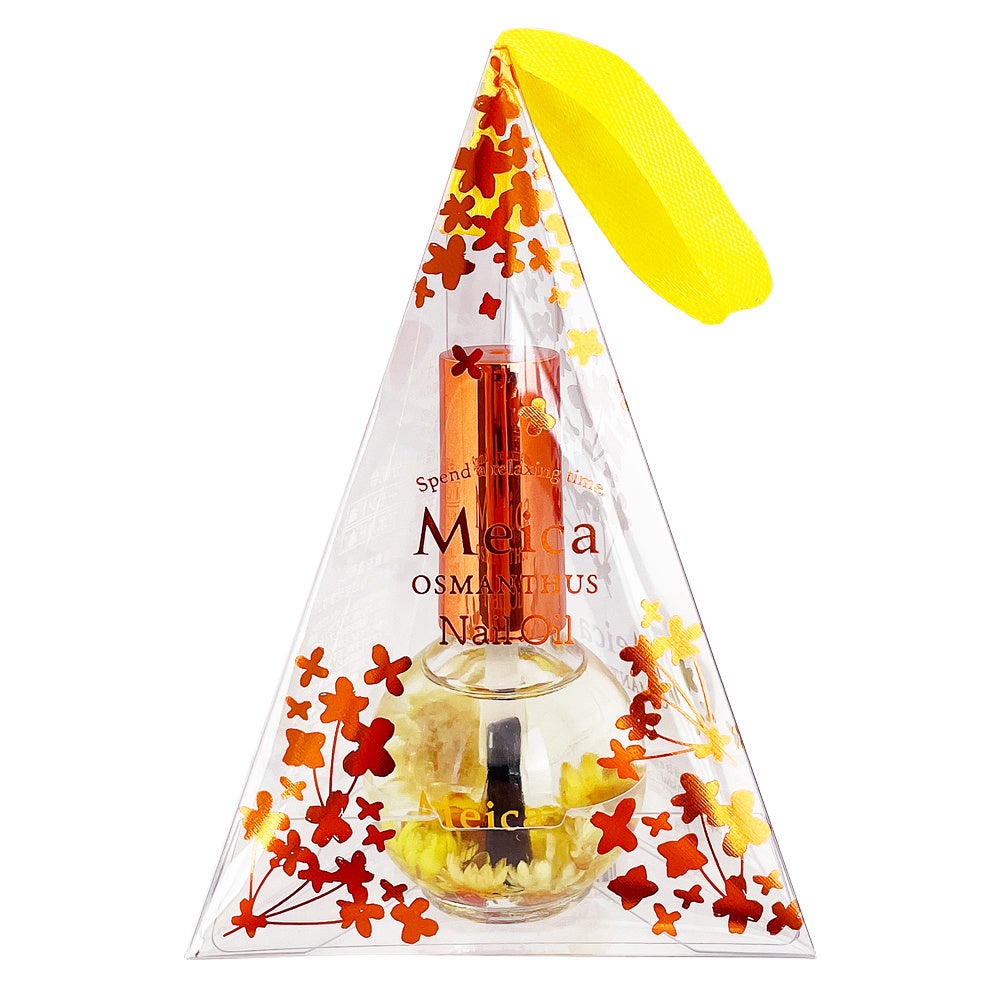 金木犀の香りがふんわりとやさしく香る4種のうるおい成分(アーモンドオイル、ホホバオイル、加水分解ケラチン、アボカド油)配合のネイルオイル。イエローのリボンと金木犀の花を散りばめたパッケージは日頃の感謝の気持ちを伝えるプチギフトにもぴったり。