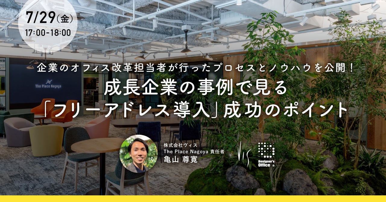 デザイナーズオフィスを手がけ、「はたらく」をデザインする株式会社ヴィス(本社:大阪市北区、代表取締役社長:金谷智浩)は、2022年7月29日(金)に、The Place Nagoya(名古屋市中区)にて、無料セミナー「成長企業の事例で見る『フリーアドレス導入』成功のポイント」を開催することをお知らせします。