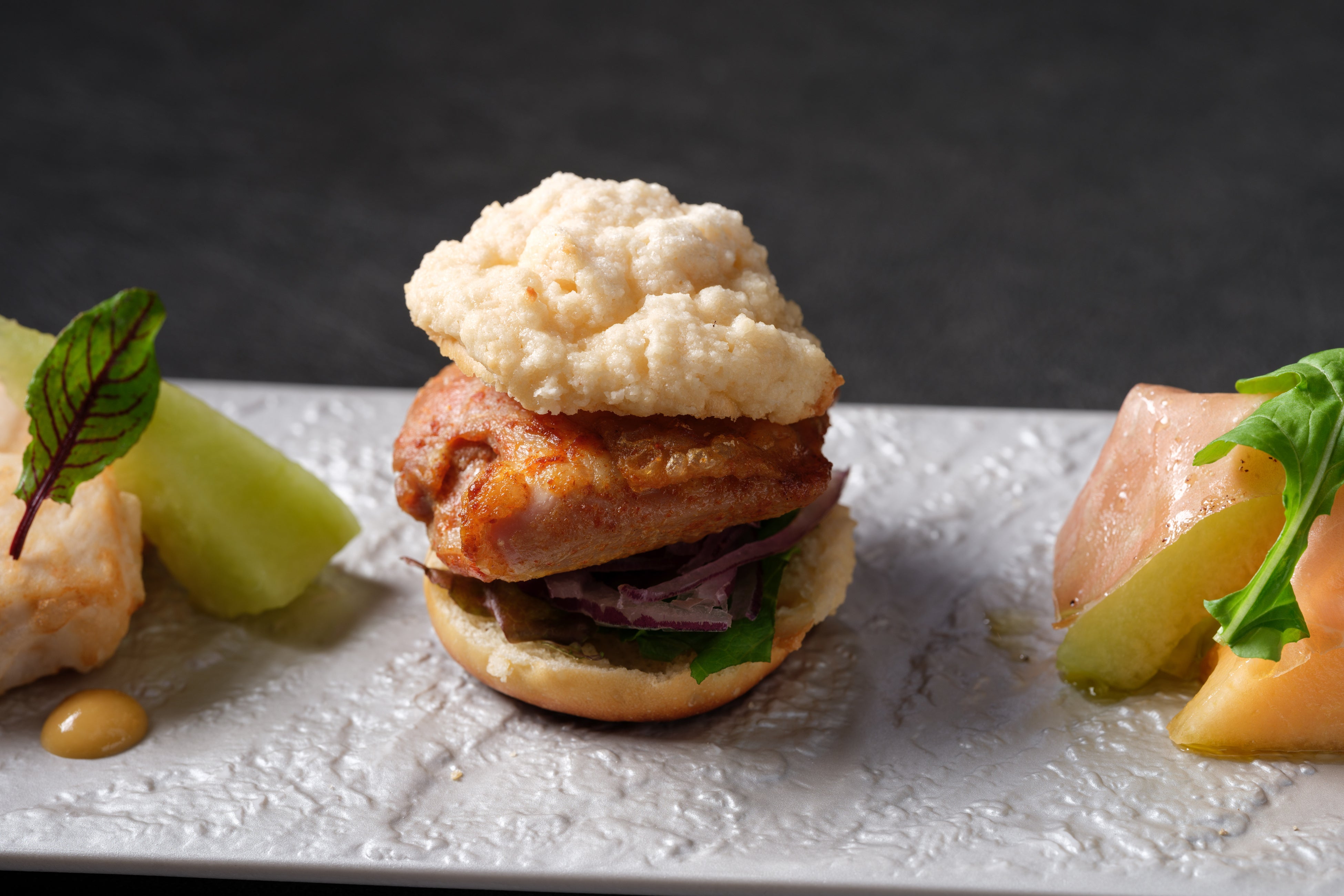 地元ベーカリー特製のメロンパンに、ケイジャンスパイスでマリネしたチキンをサンドしました。バンズの愛らしいフォルム、フルーツの甘みとスパイスがユニークなコントラストを奏でる遊び心あふれる一品。