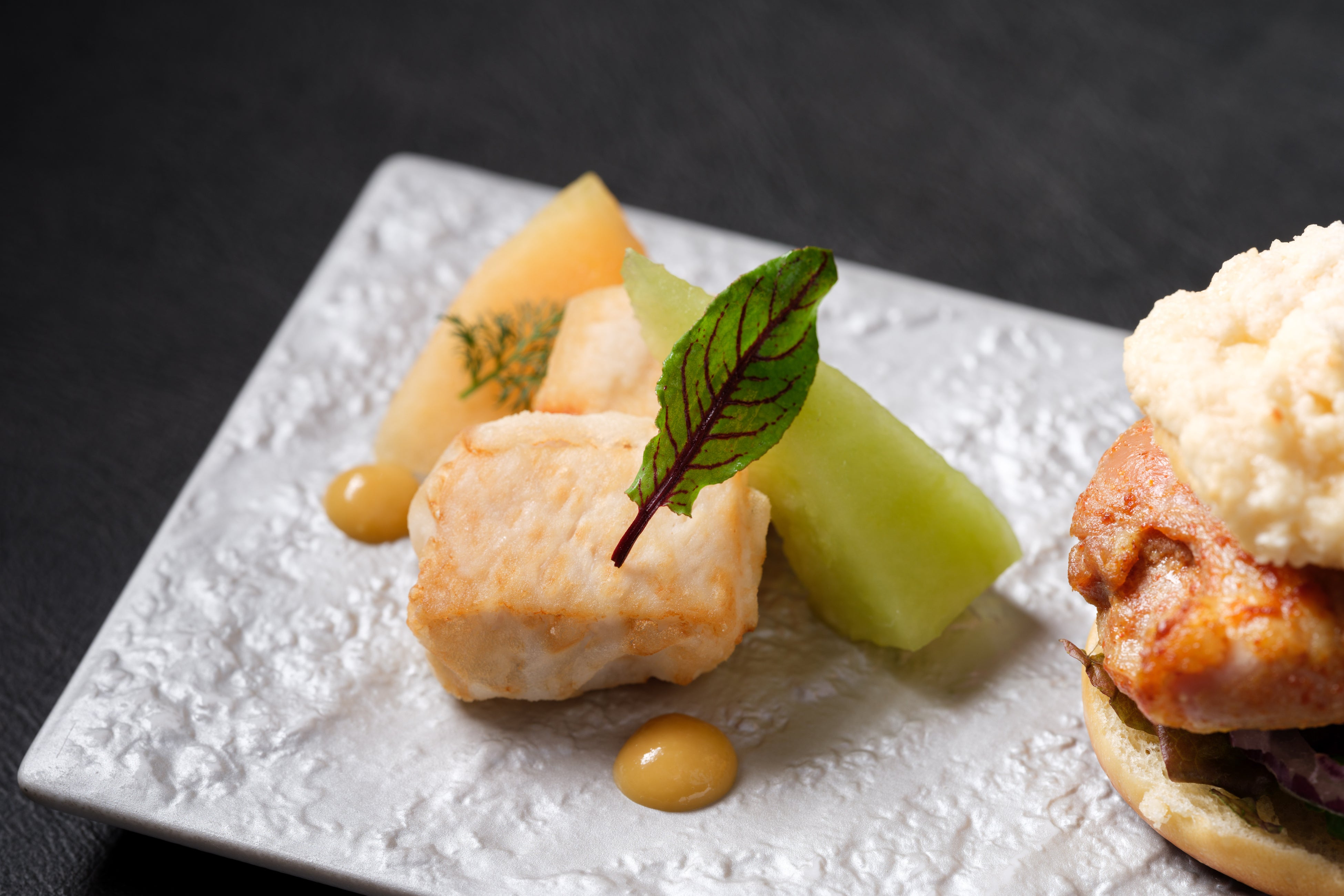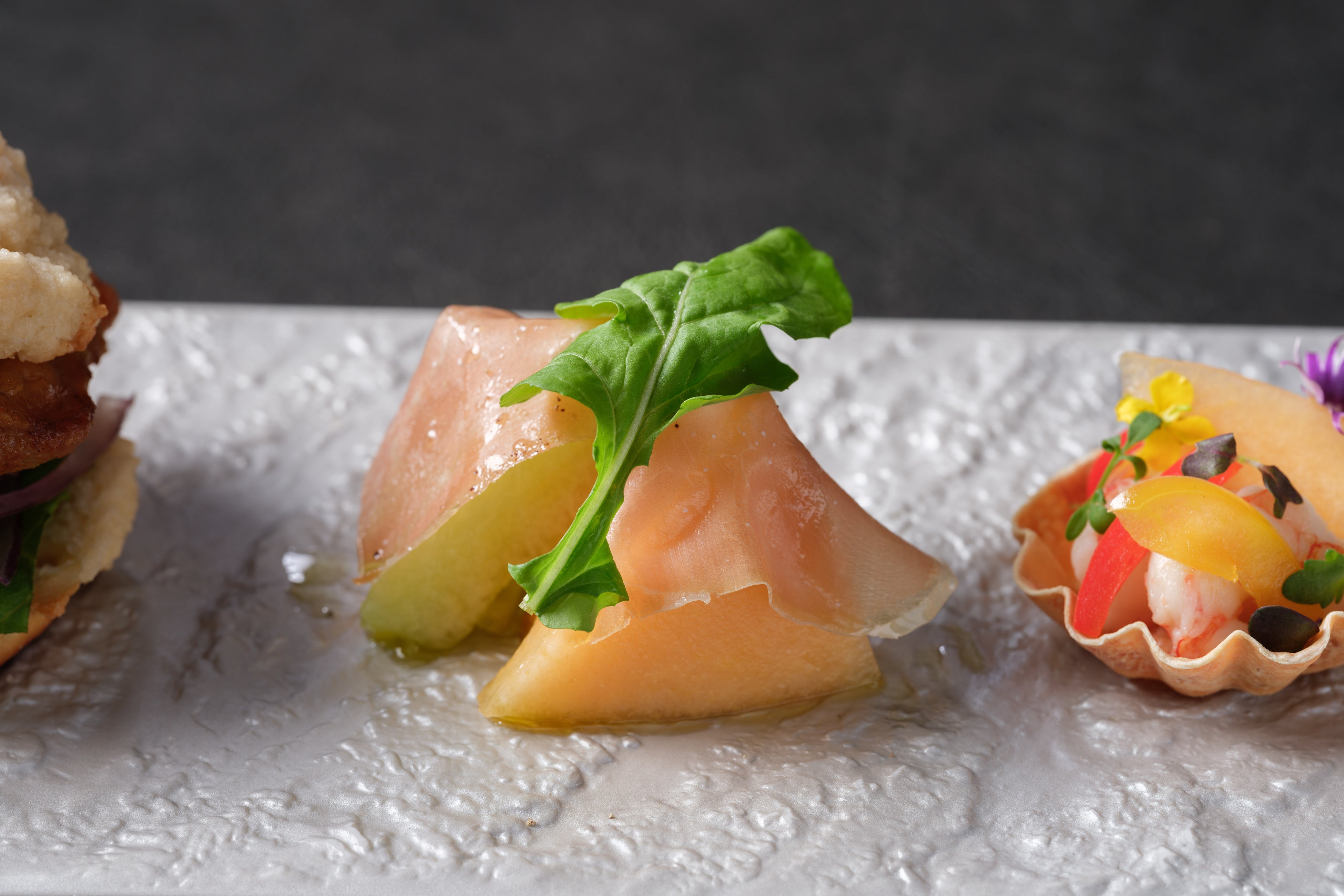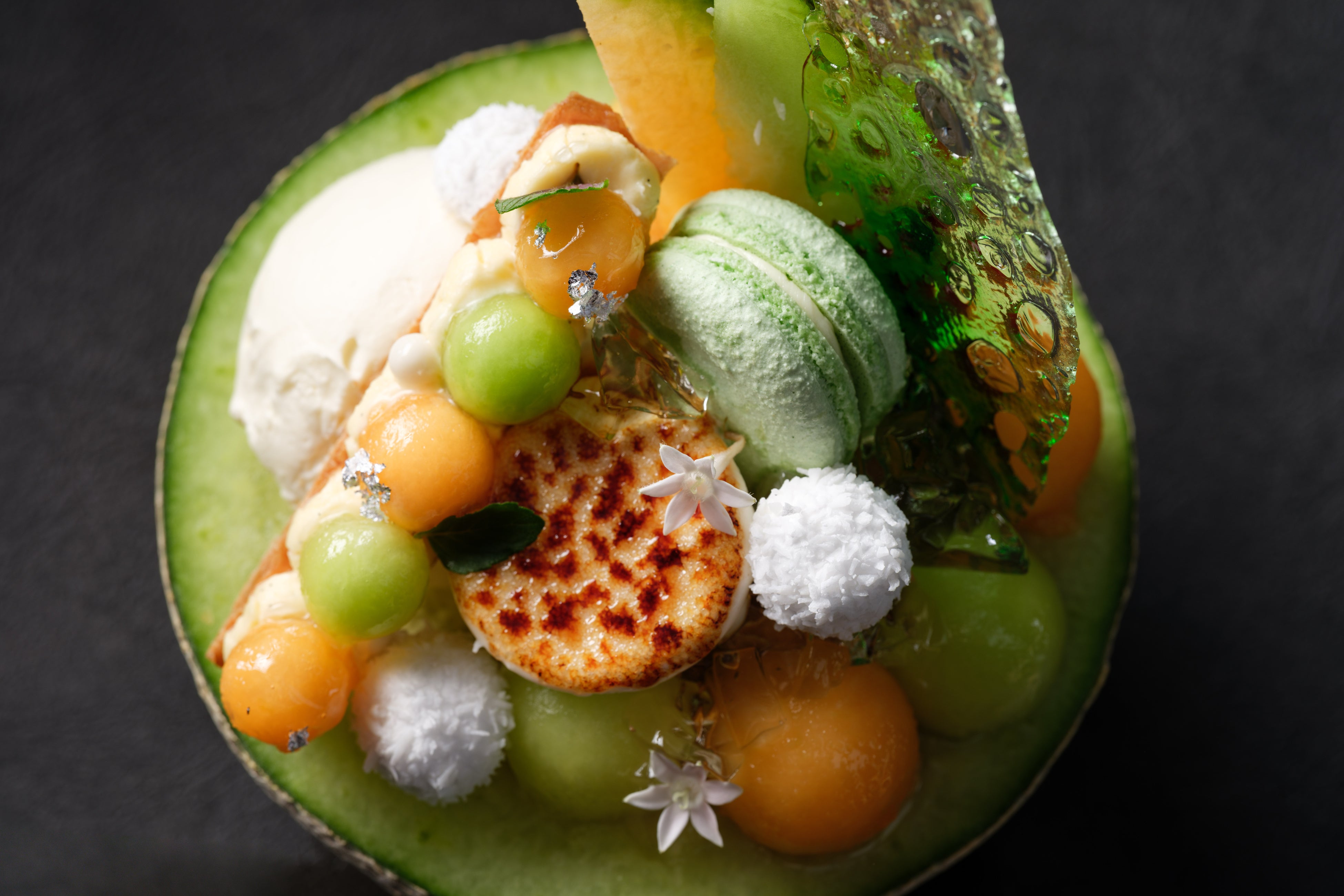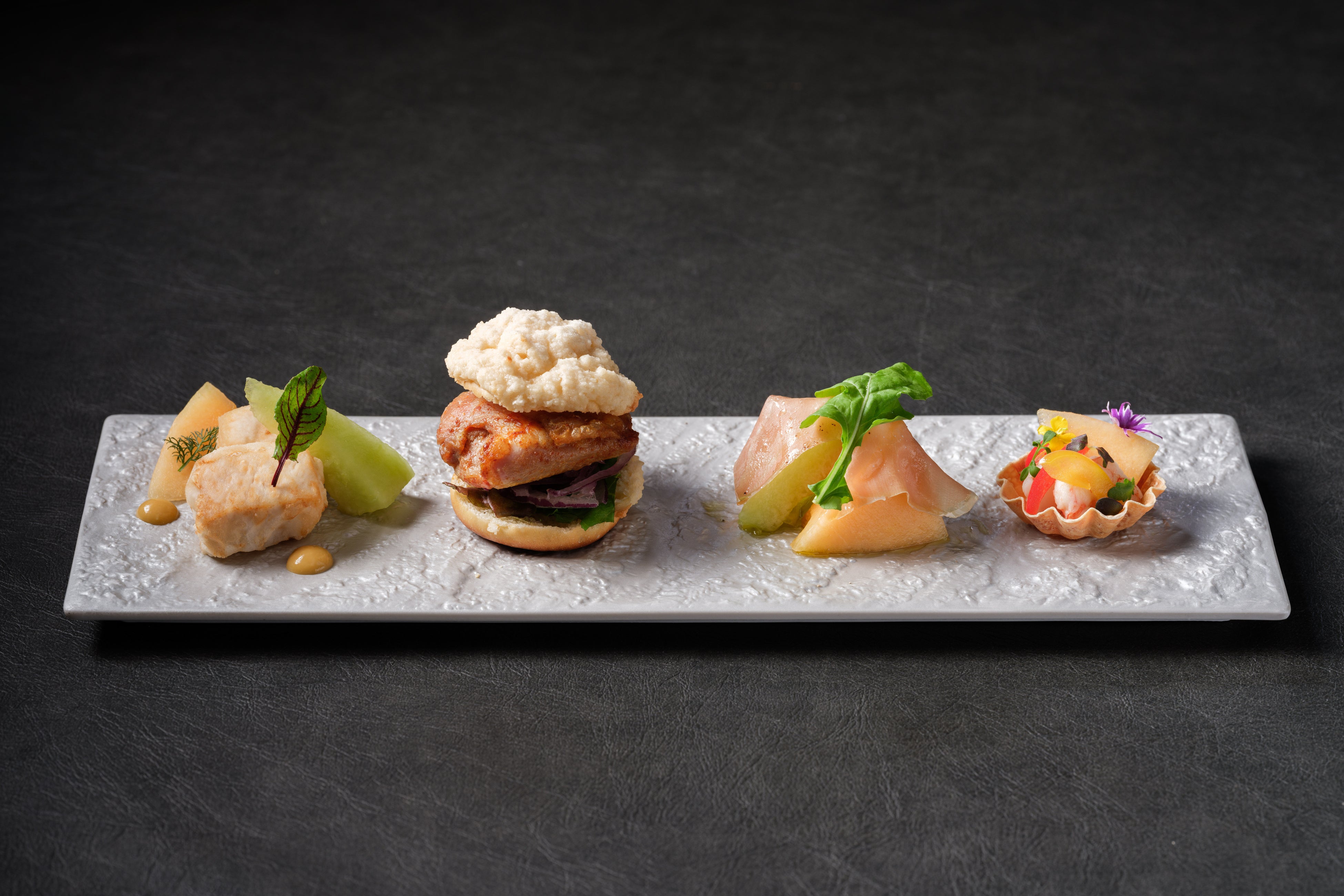 また、セイボリーには、王道の生ハム&メロンをはじめ、爽快感が広がる赤肉メロンのセビーチェ、金沢のノトヒバカラベーカリー特製メロンパンにスパイシーチキンを挟んだバーガーなどをラインアップ。メロンそのもののテイストはもちろん、ユニークなコンビネーションにもご注目ください。フレッシュな果肉の旨みと余韻、多様な素材、そして遊び心あふれる調理や演出が響き合う初夏のハーモニーを、この機会にご賞味されてはいかがでしょう。