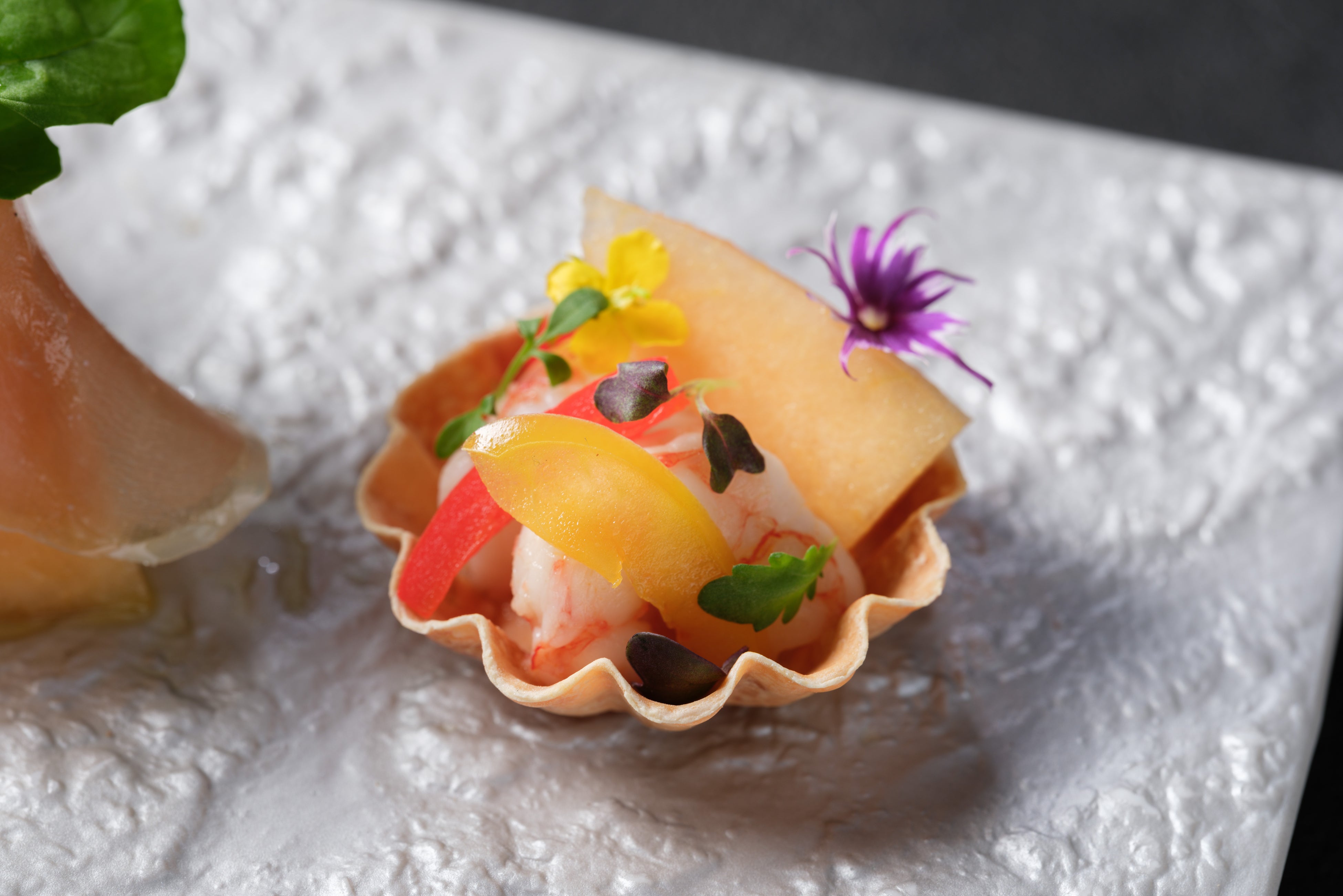 ぷりっとした海老と赤肉メロンをライムの酸味で軽やかさを加え、爽快感あふれる初夏の味わいに。