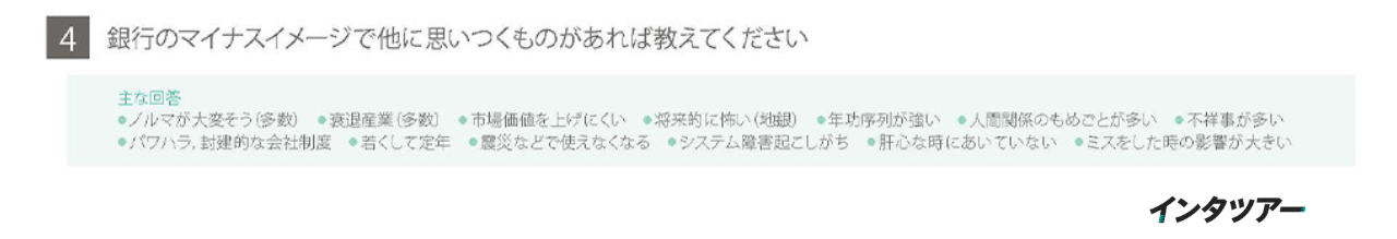 - 業界のマイナスのイメージは「昔ながらの文化」「全国転勤」「作業的」など古い組織の印象 営業ノルマや衰退産業、システム障害などのマイナスイメージも