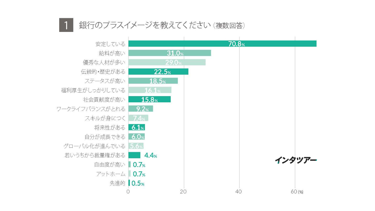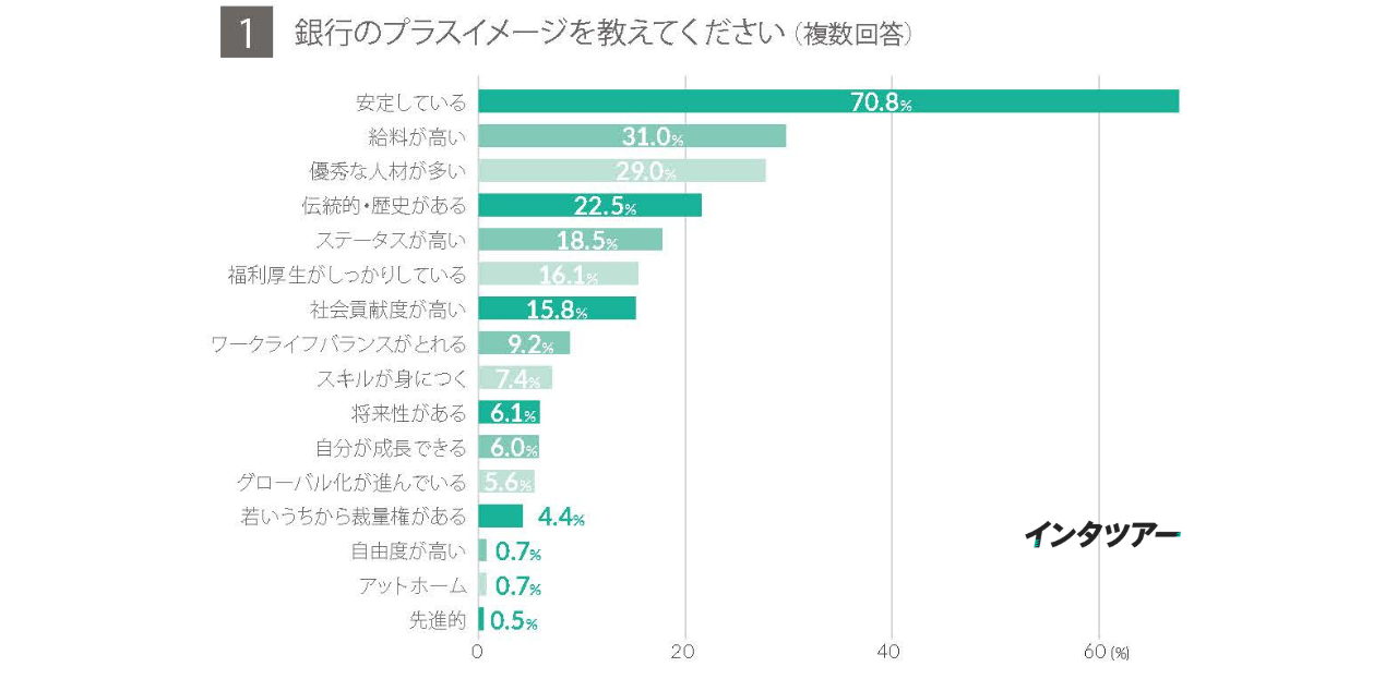 - 銀行のプラスのイメージは70.8%が「安定している」 伝統があり給与が高くステータスの高いイメージ