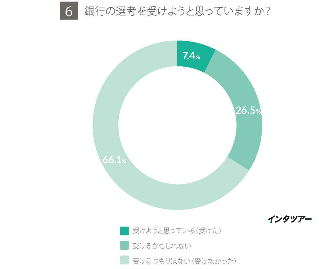 「受けようと思っている(受けた)」と答えた学生は7.4%で、「受けるかもしれない」26.5%を加えると33.9%となりました。「受けるつもりはない(受けなかった)」学生が約2/3を占め、就職の選択肢としてあまり支持されていないことがわかります。学生の安定志向が強くなっているといわれる中でも、銀行の業界としての人気はあまり高くないようです。
