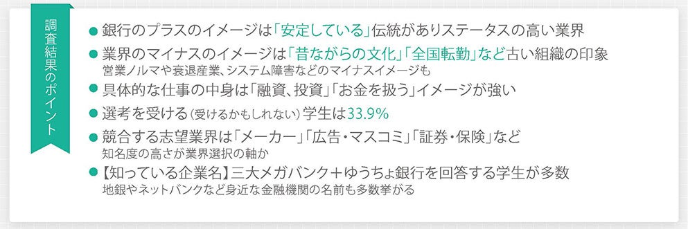 調査結果では、プラスイメージとして「安定している」の回答が70.8%と最も高く、その他「給料が高い」「優秀な人材が多い」「伝統的・歴史がある」などが上位を占めた一方で、マイナスイメージとして、およそ半数の学生が「昔ながらの文化がある」や「全国転勤がある」と答えました。また、学生の安定志向が強くなっているといわれる中でも、選考を受ける(受けるかもしれない)学生は33.9%と他の人気業界と比べて少数にとどまりました。