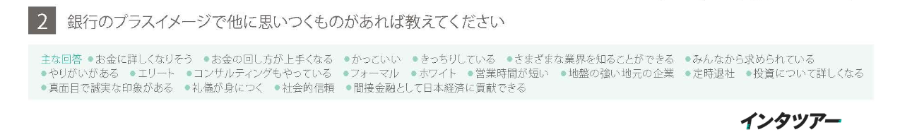 設問2では自由記述で銀行の良いイメージを聞きました。「お金に詳しくなりそう」「投資について詳しくなる」といった貨幣経済の担い手としてのイメージに加えて、「フォーマル」「きっちりしている」などの堅い仕事としてのイメージを挙げる学生が多数を占めました。