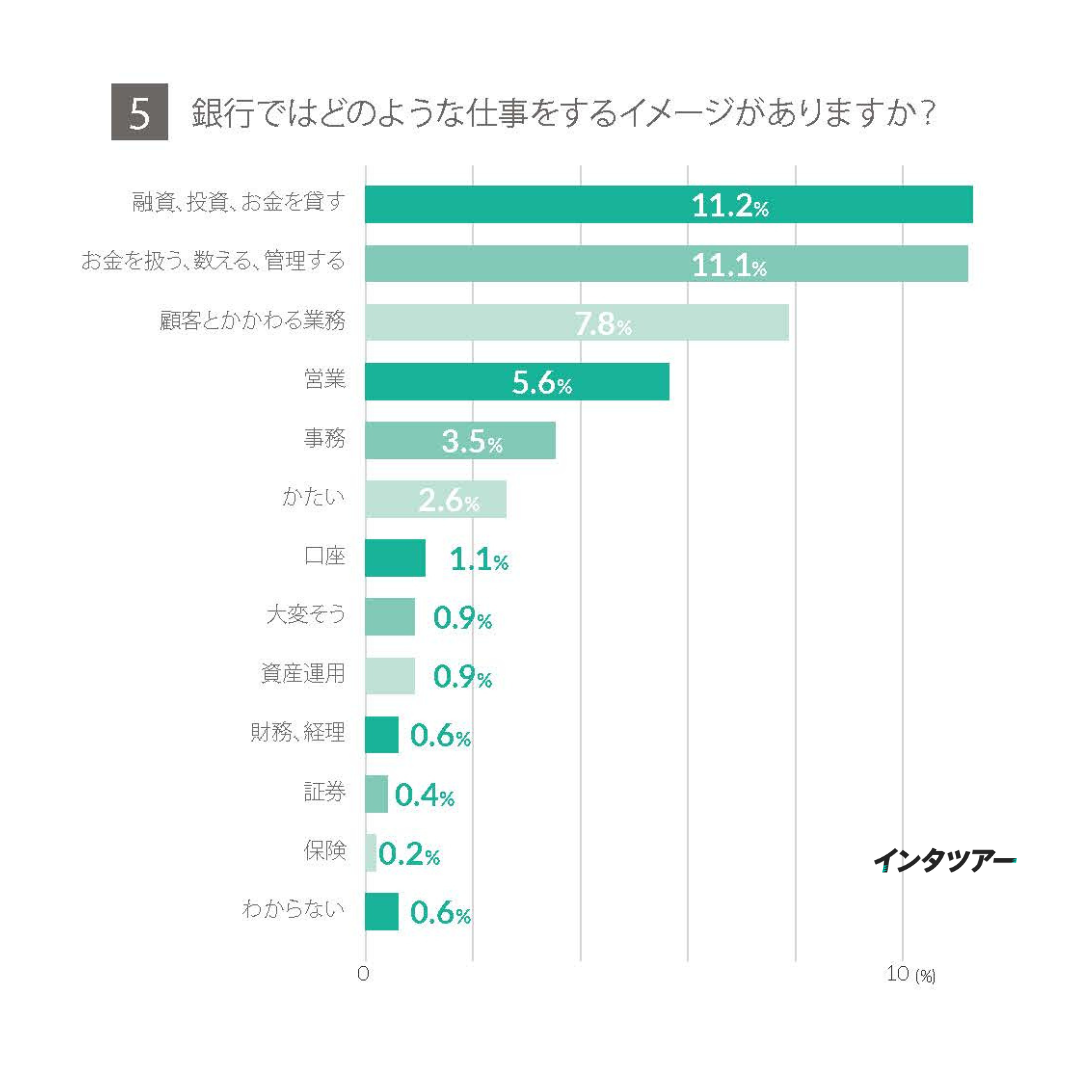 「融資、投資、お金を貸す」11.2%、「お金を扱う、数える、管理」11.1%、といったキーワードが上位を占めたほか、「顧客とかかわる業務(窓口業務など)」7.8%に比較的多くの回答がありました。