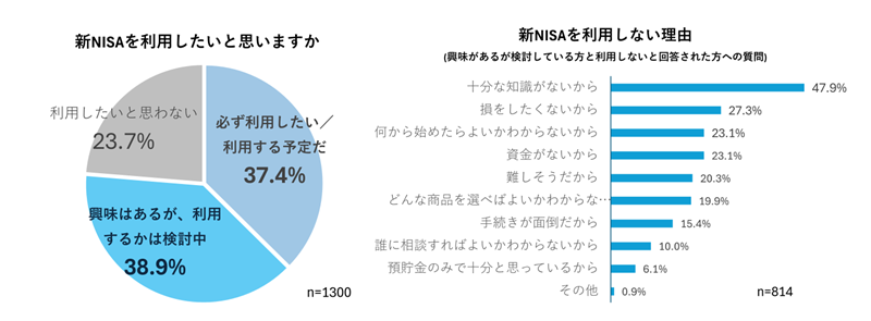 「新NISAを現時点で利用したいか」と聞くと、「必ず利用したい/利用する予定」37.4%、「興味はあるが、利用は検討中」38.9%、「利用したいと思わない」23.7%という結果となり、利用を検討中の人も含めると、7割を超える人が新NISAに対して前向きな現状が分かりました。一方でNISAを利用したいと思わない人の主な理由は「十分な知識がない」「損をしたくない」「何から始めたらよいか分からない」などといった声が挙げられました。