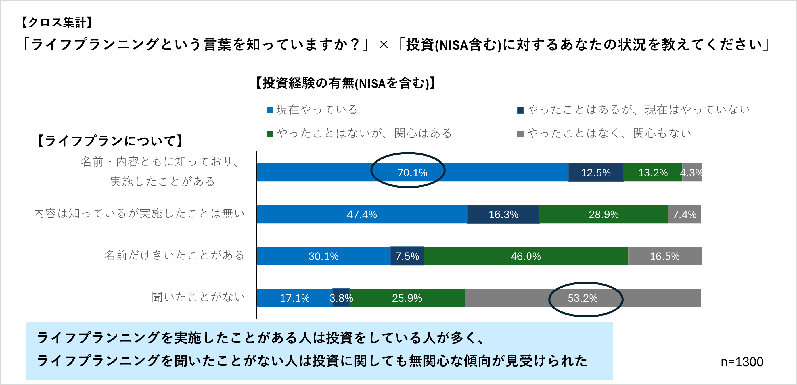 「ライフプランニングという言葉を知っていますか」と「投資(NISA含む)に対するあなたの状況を教えてください」と、それぞれ質問してクロス集計をしたところ、「ライフプランニング実施したことがあり、投資を現在やっている」と答えた人が70.1%。一方で、ライフプランニングについて聞いたことがない人のうち、投資に対して関心がない人が53.2%というライフプランと投資の関心度が比例する結果になりました。