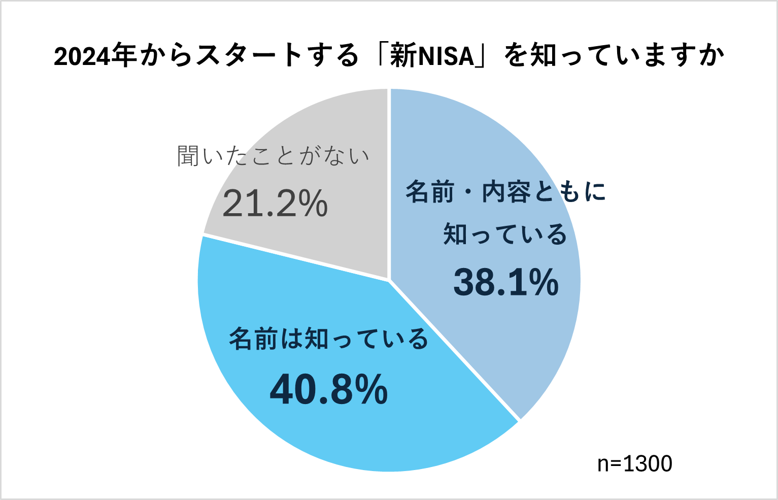 「新NISAを知っていますか」と聞いたところ、「名前内容ともに知っている」38.1%、「名前は知っている」40.8%、「聞いたことがない」21.2%と、新NISAの内容まで知っている人は38.1%に止まりました。