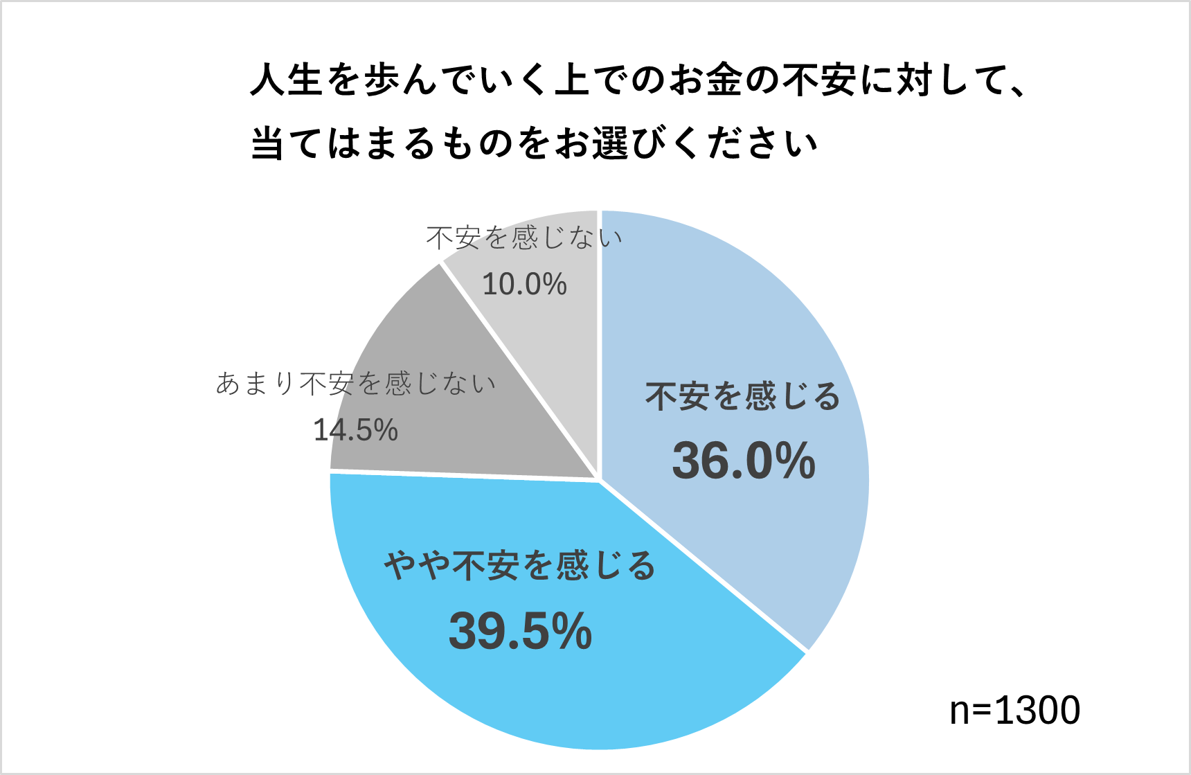 「今後の人生においてお金の不安があるか」を聞くと、不安を感じる36%、やや不安を感じる39.5%となり、7割を超える人が不安を抱えている現状が明らかになりました。
