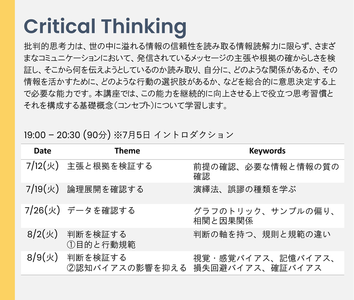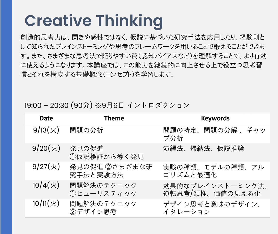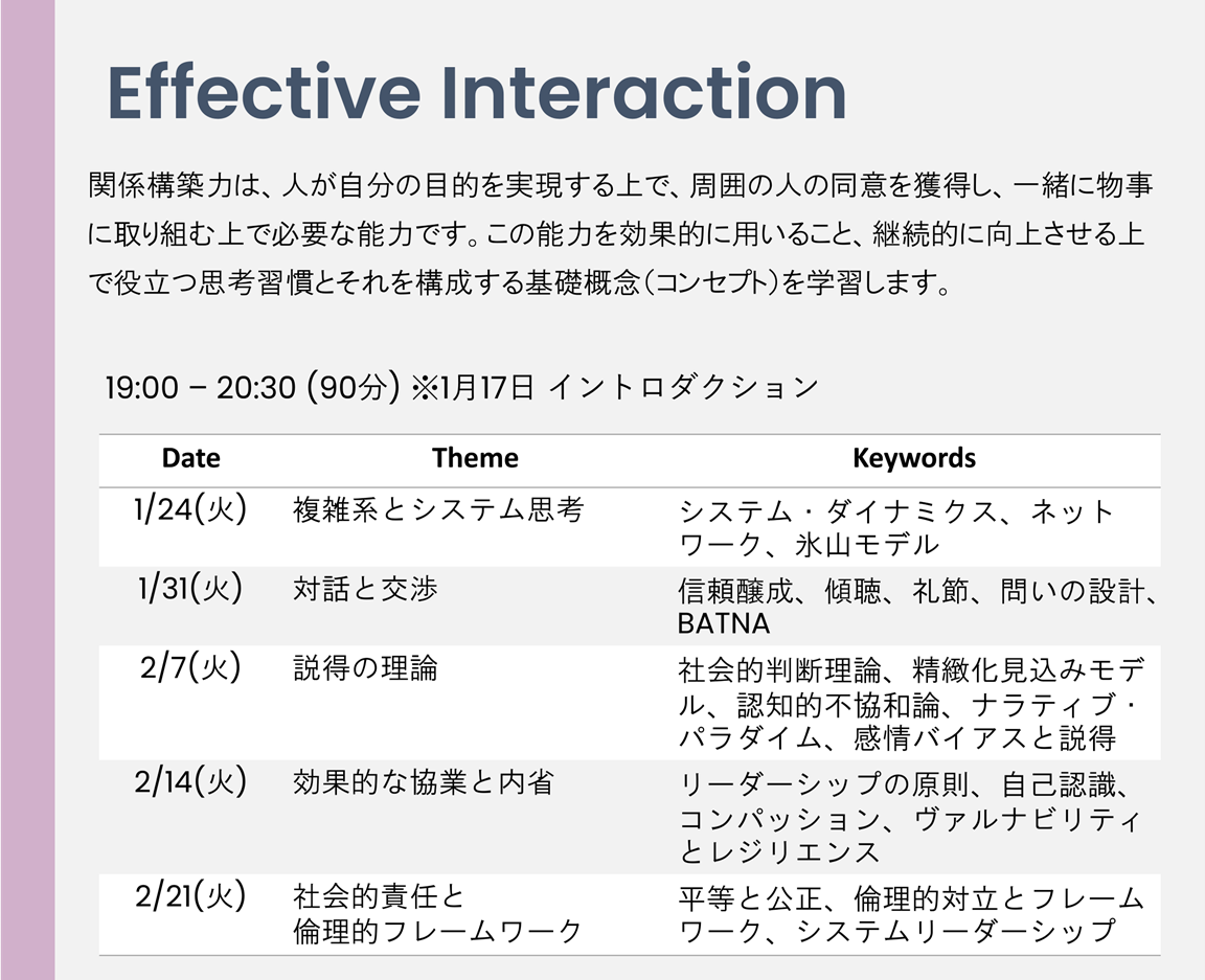 本プログラムは世界中から注目されているミネルバ大学のカリキュラムを参考に日本の社会人や学生向けにアレンジし、リーダーとして必要な「思考力」を磨きます。ミネルバ大学が提唱する、認知科学に基づいた、思考習慣と基礎概念によって構成されるCritical Thinking、Creative Thinking、Effective Communication、Effective Interactionの4つのコアコンピテンシーに紐づけされた「実践的な知恵」を、実社会の事例などを題材に用いながらお届けします。