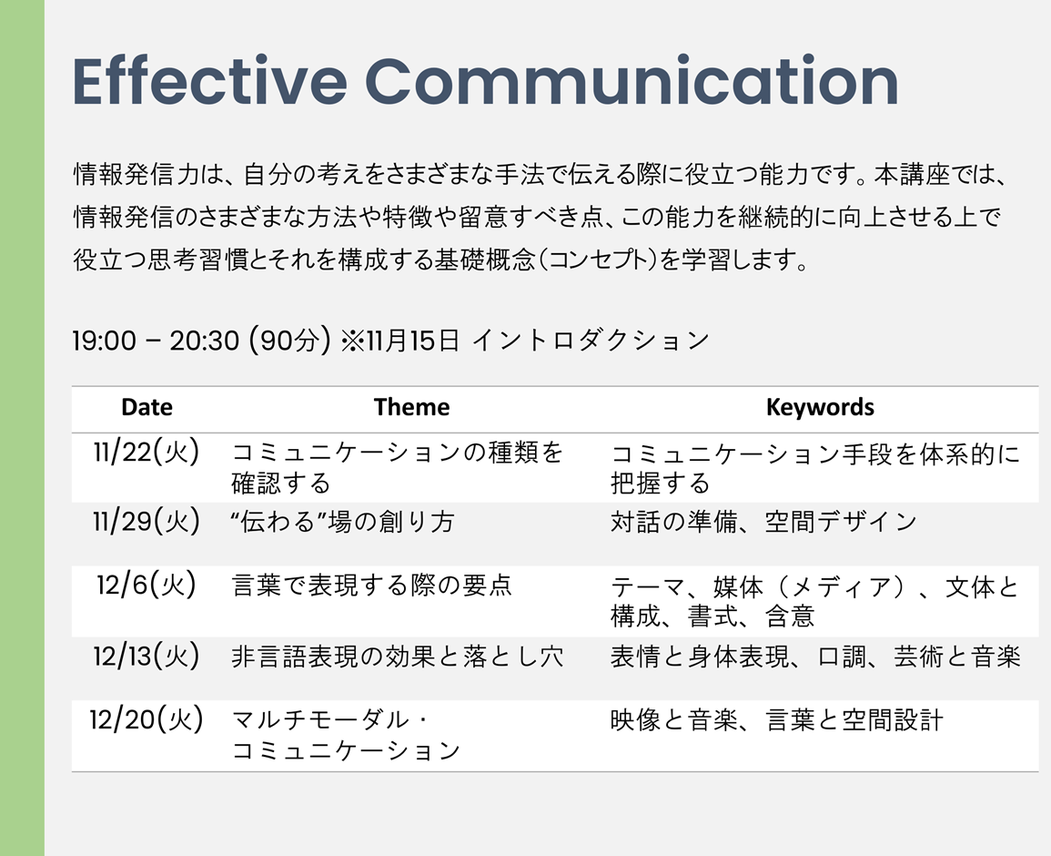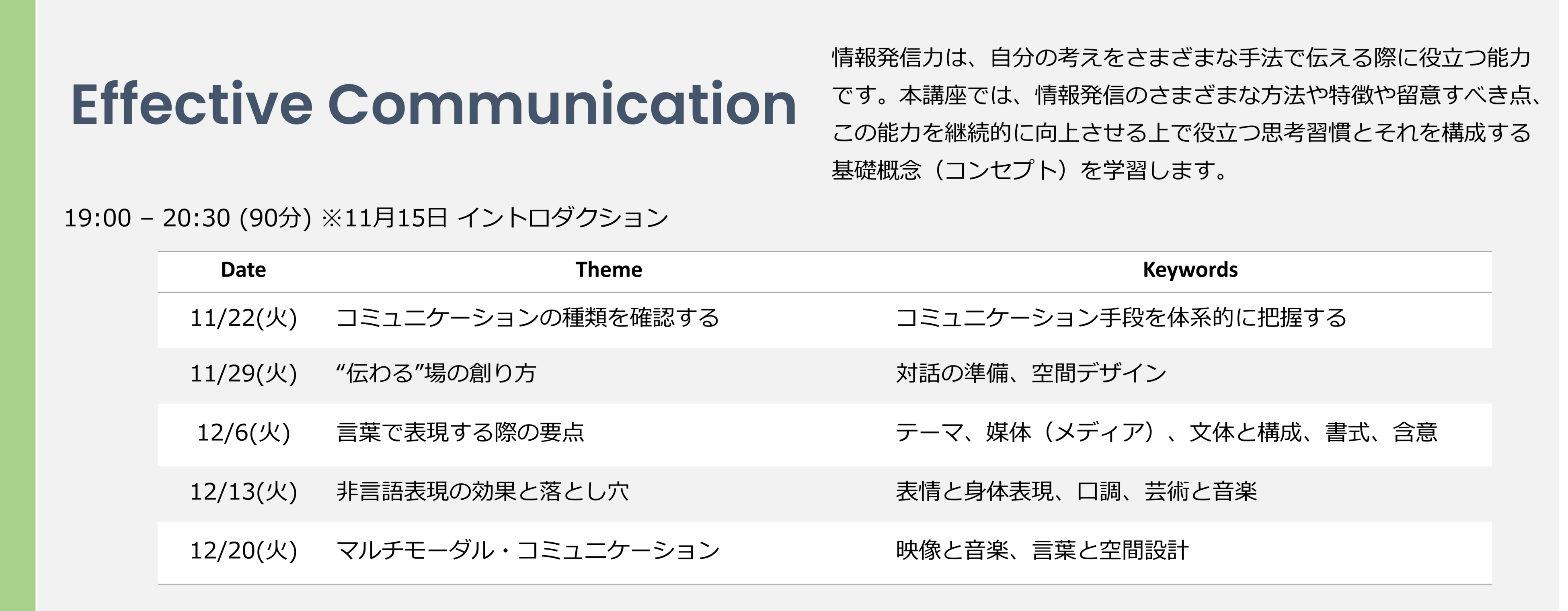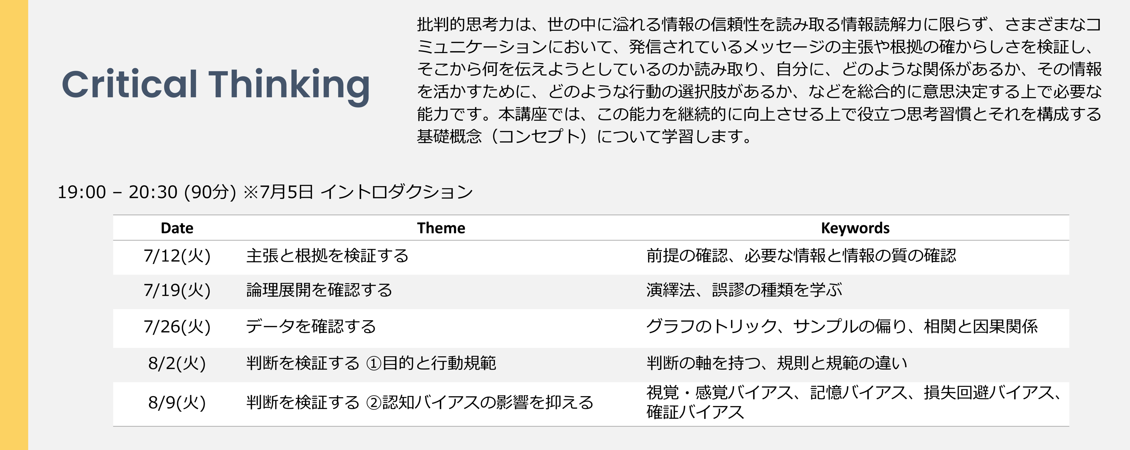 本プログラムは世界中から注目されているミネルバ大学のカリキュラムを参考に日本の社会人や学生向けにアレンジし、リーダーとして必要な「思考力」を磨きます。ミネルバ大学が提唱する、認知科学に基づいた、思考習慣と基礎概念によって構成されるCritical Thinking、Creative Thinking、Effective Communication、Effective Interactionの4つのコアコンピテンシーに紐づけされた「実践的な知恵」を、実社会の事例などを題材に用いながらお届けします。