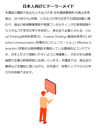 ミネルバ大学では、これらの能力を習得することは、急速に進化する世界で成功するためには不可欠であり、且つ世界のトップ企業が求めているスキルだとしています。今般、注目を集めているDXの推進においても、すべてのスキルに精通する汎用的な「思考力」を習得することが成功の秘訣だといわれています。