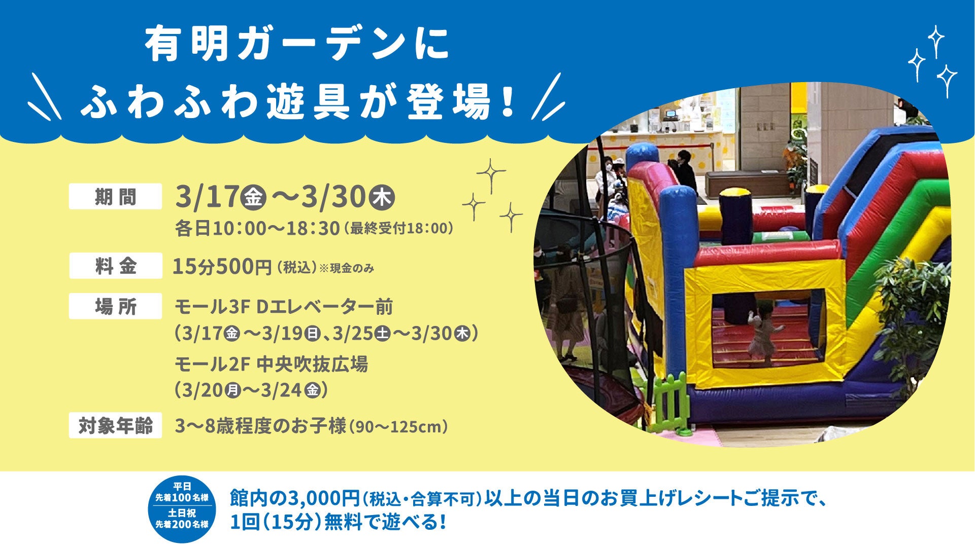 ■ふわふわ遊具 レシートで先着無料キャンペーン概要 期間:2023年3月17日(金)~30日(木)各日10:00~18:30(最終受付18:00) 内容:有明ガーデン内店舗の、3,000円(税込)以上の当日お買い上げレシートご提示で、ふわふわ遊具が無料(1回15分)で遊べます。 ※レシート合算不可。対象年齢:3~8歳のお子さま(身長90~125cm) |