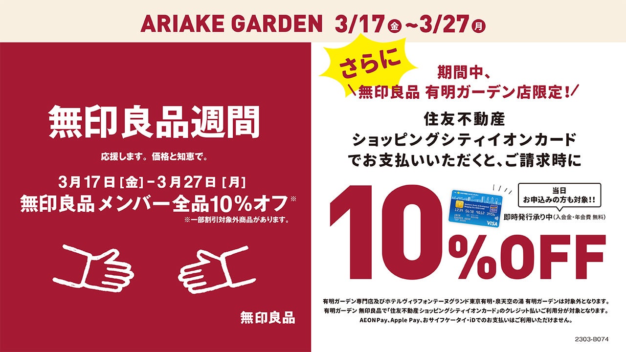 全国の無印良品で3月17日(金)からスタートする「無印良品週間」に合わせ、期間中「無印良品 有明ガーデン店」でのお買い物を「住友不動産 ショッピングシティイオンカード」でお支払いいただくと、ご請求時に10%オフになるキャンペーンを実施いたします。