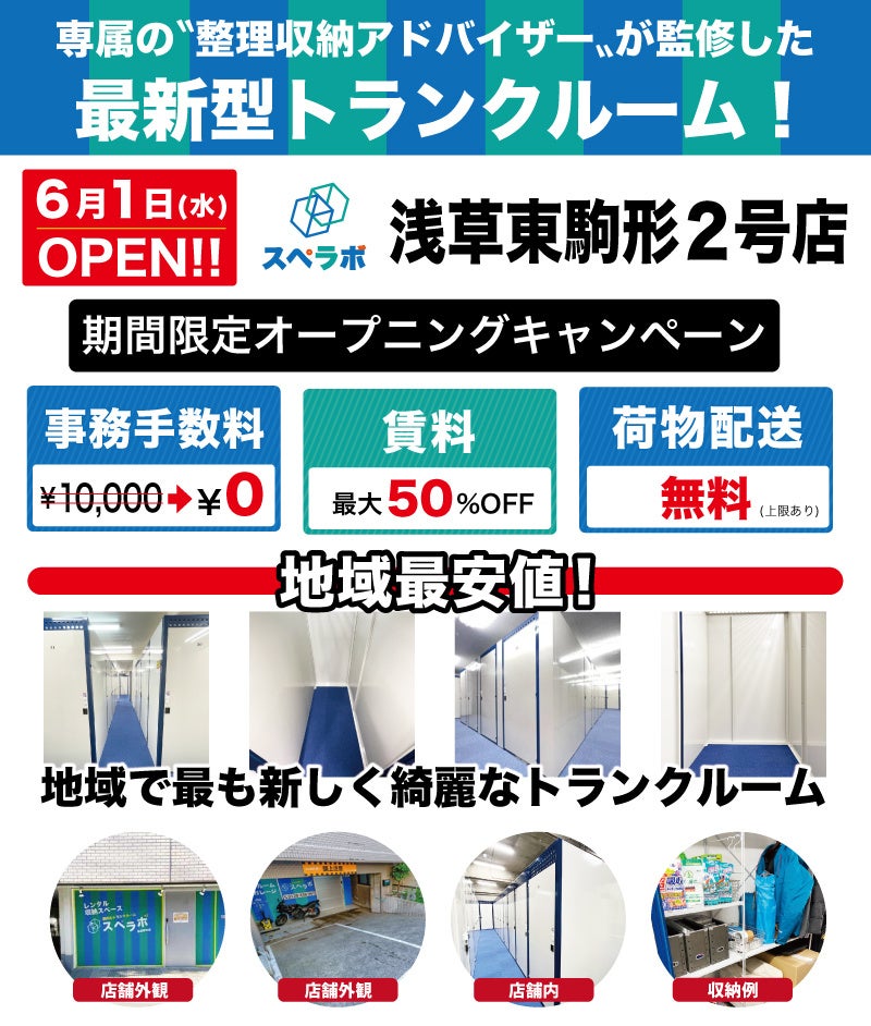 【6月1日(水)オープン】見学から契約、解約まで完全非接触・非対面、お申し込みからご利用まで最短1時間!都内にて絶賛運営中のトランクルーム【スペラボ】が浅草・墨田区東駒形に出店!