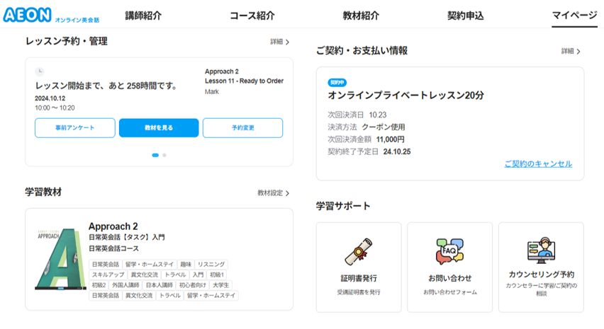 マイページでは、「AIレベルチェック」の結果や、レッスン担当教師からのレッスン後フィードバックを閲覧できます。レッスンの予約・変更や受講証明書の発行、契約内容、メールアドレスやパスワード、クーポン管理など、基本情報の確認・変更にご利用いただけます。