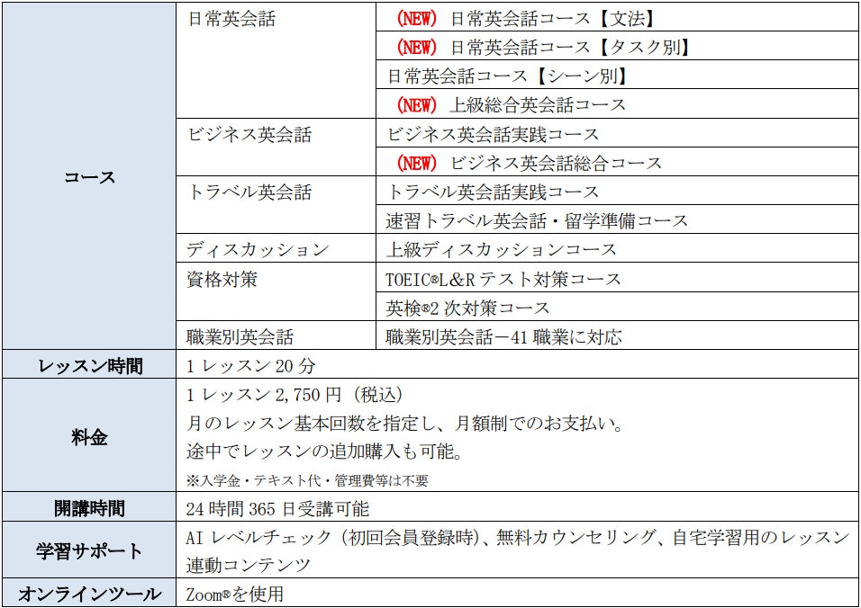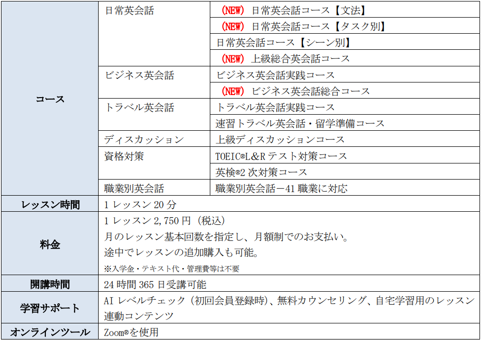 === サマリー === ●イーオン品質のオンラインレッスンへの拡大 ●新たに「AI レベルチェック」を提供開始。AI が現在のレベルを診断したうえで、学習目的も加味して テキストやレッスン内容を提案 ●カウンセリング、レッスン後フィードバックなどのサポートによる成果の実感で、英語学習に対する モチベーションをアップ ●レッスン内容、テキストレベル、教師、受講回数などを目的に合わせて変更可能 ●1 レッスン 2,750 円(税込)のみのシンプルな価格設定(テキスト代・その他費用は不要) ●開講時間を 24 時間 365 日に拡大。お手続きをオンラインで完結できるようにし、利便性を向上 ●2024 年 12 月末まで「パワーアップキャンペーン」を実施 ※初回会員登録でレッスン料に使える最大 11,000 円分(税込)のクーポンプレゼント |