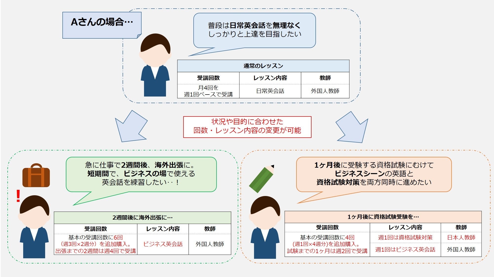 例えば同じテキストでも「今日は発話量を増やしたい」「できる限りリスニング中心で学びたい」という要望や、「通常は日常英会話のスキルアップを目的としたレッスンにしているが、出張に備えたビジネス英会話を中心としたい」「プレゼンテーションに備えたい」あるいは、「資格取得のためのレッスンにしたい」などの要望を踏まえて構成することもできます。