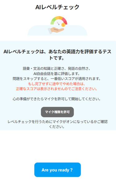 初回会員登録時に行う「AIレベルチェック」では、所要時間約15分 問題数31問(語彙・文法・発話・AI自由会話)に回答をしていただきます。結果はCEFR(※)や資格試験のレベル、およびイーオン独自基準の10段階でAIが判定します。