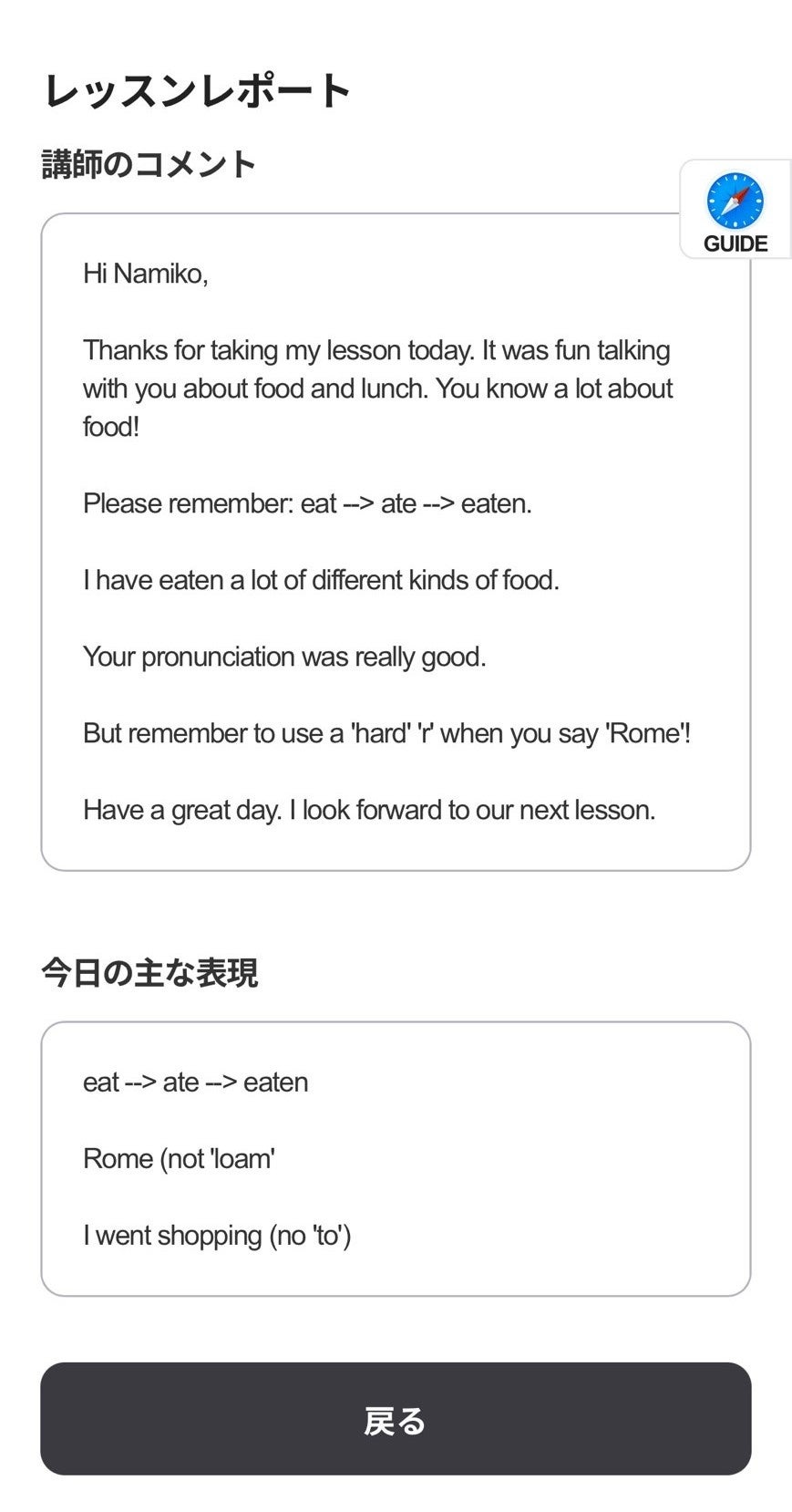 毎レッスン後には担当教師からレッスン後フィードバックがマイページに届きます。レッスンをただ受けて終わりにするのではなく、良かった点・より良くできる点を振り返ることができます。