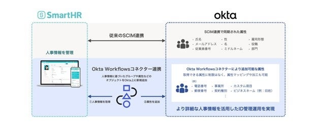 SmartHRは、Oktaが展開する7,500以上の事前連携アプリテンプレート群「Okta Integration Network(https://www.okta.com/jp/okta-integration-network/)」(OIN)とのSAML連携、SCIM連携(*1)にいち早く対応し、OktaとSmartHRを利用するお客様は、従業員が所属する部署や役職などの人事情報に基づいてアプリケーションの割当・解除の自動化を実現してきました。今回、新たにOkta Workflowsのコネクター連携が加わることで、より細かいレベルでの人事情報を連携できるようになります。例えば、ユーザーの在籍状況や契約種別、事業所などの人事情報を新たに取得できるようになりますので、SCIM連携だけでは十分でなかった人事情報に基づくアカウント管理の自動化が実現します。これにより、IT管理者や人事担当者の負荷を大幅に削減することができ、過剰なアクセス権限付与やアカウントの解除漏れによる情報漏洩のセキュリティリスクを低減できます。