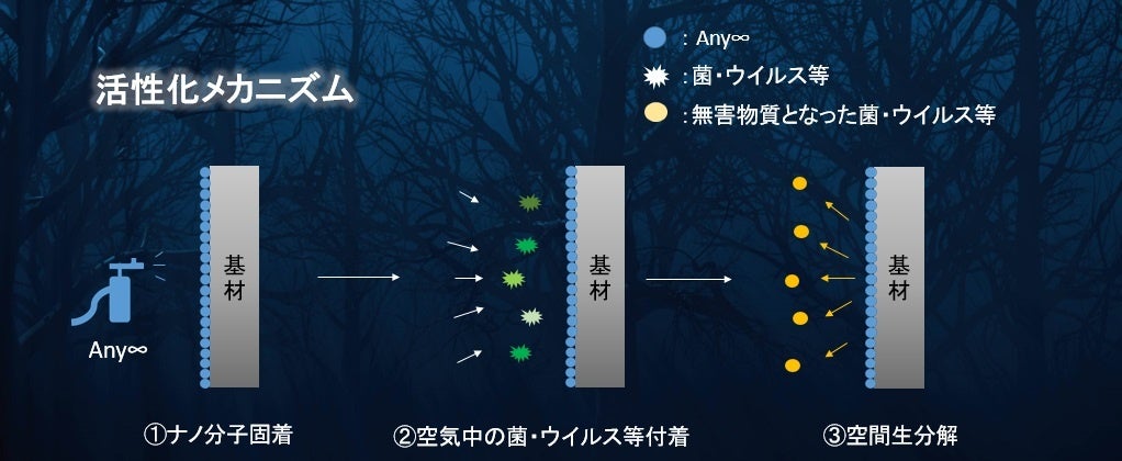Any ∞(エニー ループ)は、繊維や壁などに噴射塗布するだけでナノレベルの分子が乾燥、強力固着し、ナノ被膜を形成し、有害物質の浄化(浄菌・浄ウイルス)、きれいな空気を生み出します。防汚・防臭・防カビの機能性も実証されています。