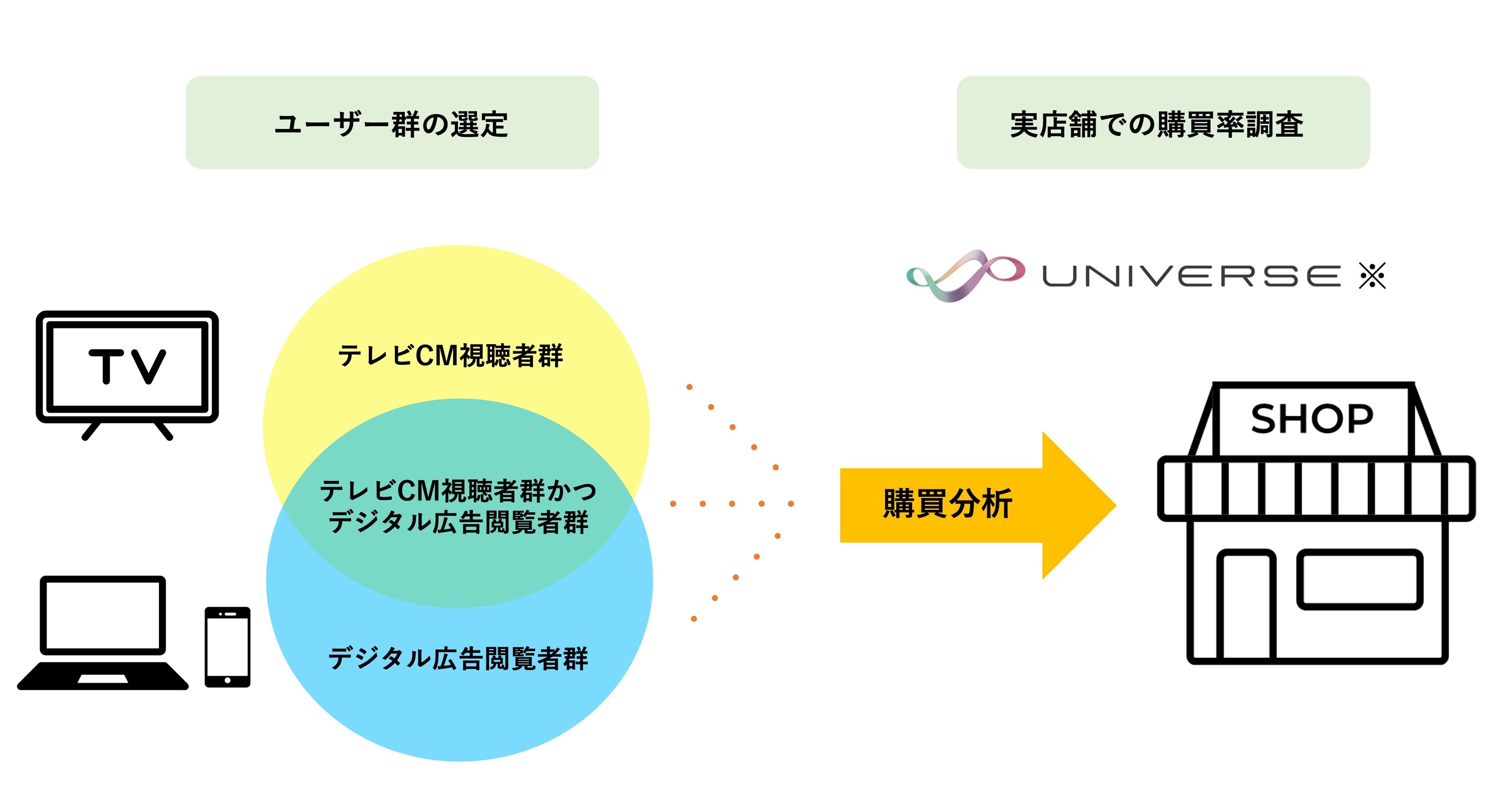 「UNIVERSE TV-Audience Targeting」と「Ponta」の保有データを連携することで、広告配信の効果計測として、新たに、実店舗における購買分析を開始いたします。