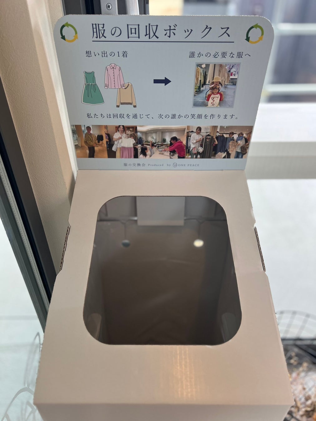 ワタワンでは、回収BOXでの事前持ち込みも可能です。回収BOXに持ち込まれた着数に応じて、服の交換会開催期間にご利用いただける引き換えチケットをお渡し。