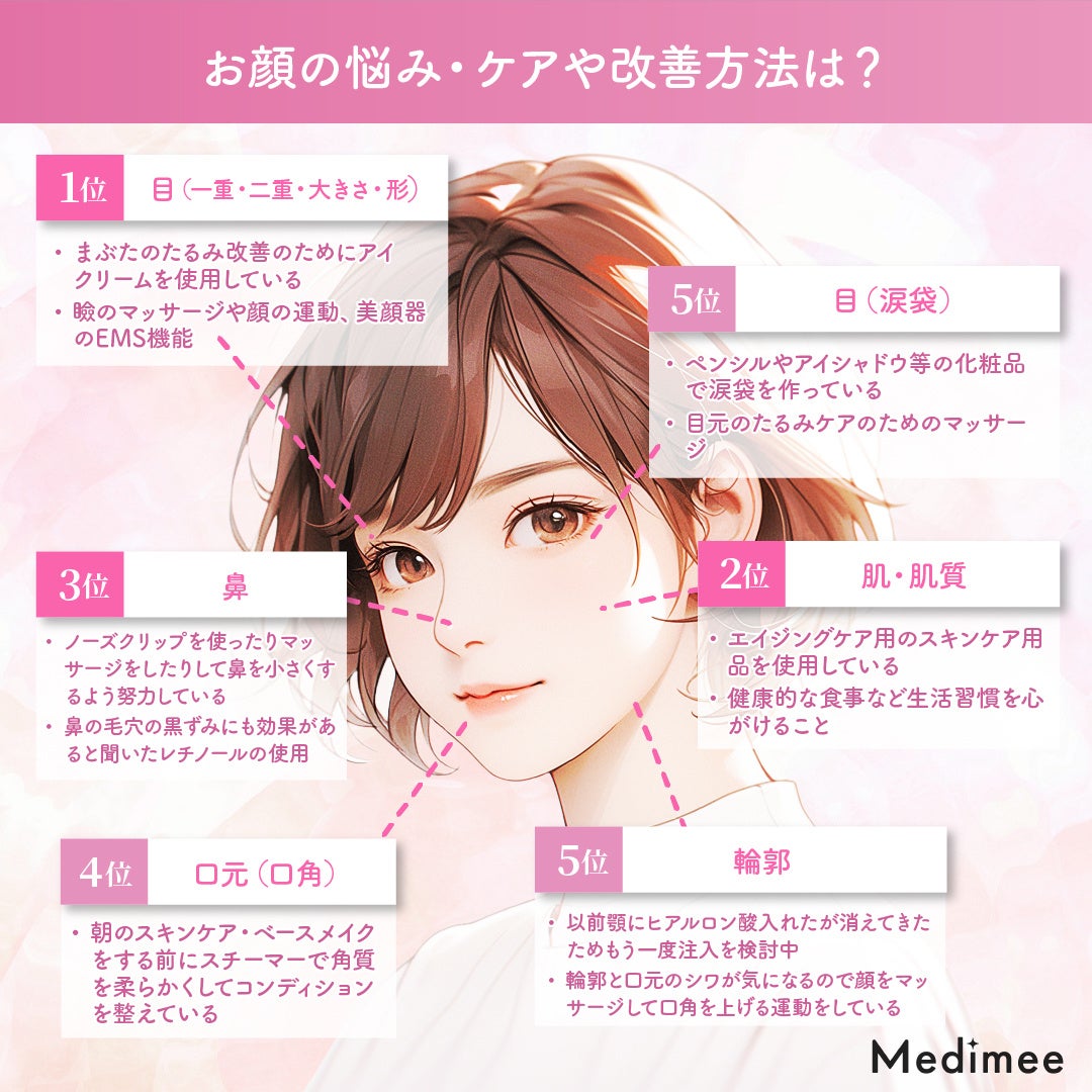 顔の悩みを聞いてみたところ、3割以上の方が「目(一重・二重・大きさ・形)」あるいは「目(涙袋)」など、目元に悩みを持っていることが分かりました。また、次いで多かった回答は「肌・肌質」でした。