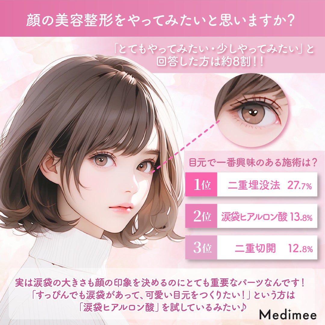 また、目元の美容整形で興味のある施術について聞いてみたところ、「二重埋没法」が最も多い結果となり、次いで多かった回答が「涙袋ヒアルロン酸」でした。