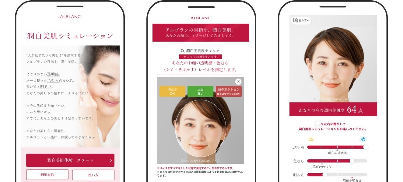「AI肌診断」機能を搭載したアルブランの「潤白美肌シミュレーション」は、撮影したユーザーの顔写真を基に「透明感」「色むら」「明るさ」の3項目を解析して、潤白美肌度を算出します。ユーザーは、撮影後にそれぞれ3項目の指標を動かし、肌状態の可変をご自分の顔でシミュレーションして、“人が気づく美しさ”を追求するアルブランのコンセプトである「潤白美肌」についてより理解を深めることが出来ます。
