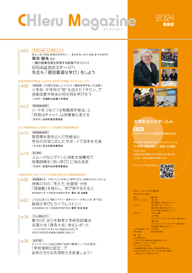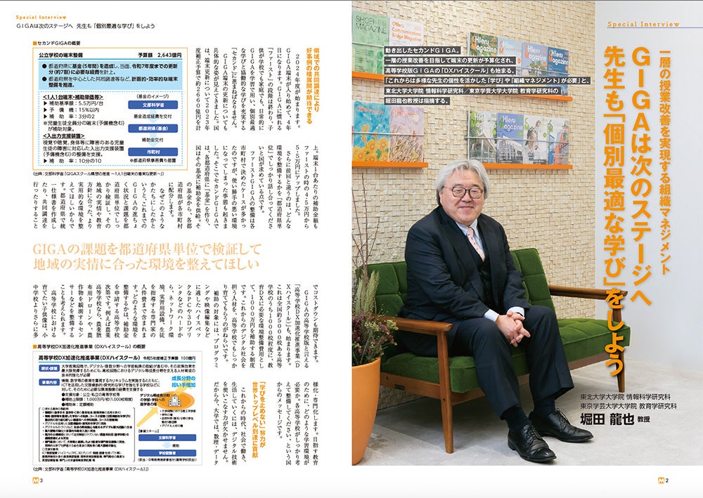 「小学校・中学校版」の巻頭インタビューでは、2024年度のGIGAスクール構想は、1人1台端末が配備された「ファースト」から個別最適な学びを充実させる「セカンド」の段階に入ると定義。東京学芸大学教職大学院の堀田龍也教授は「子供と同様に、先生も一人ひとりが『個別最適』に学び、その先生らしい授業改善に取り組んでいくべき」と指摘します。