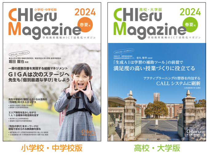 『CHIeru Magazine(チエルマガジン)』は、小学校から大学まで学校現場を対象に、多くの教育の情報化推進担当者の方にご購読いただいているチエル独自の教育ICT情報誌です。発行は年2回(4月上旬・10月上旬)、小学校・中学校版及び高校・大学版合わせて6万部を発行しています。