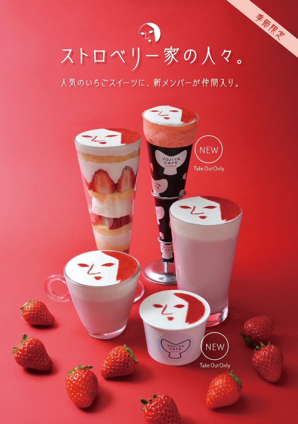 嵯峨野嵐山店では、いちごスイーツの定番ショートケーキをよーじやカフェの看板メニュー「顔パフェ」で再現した「いちごショートケーキパフェ」と、練乳のやさしい甘みとの相性抜群の「いちごカプチーノ」の2種類を店内でゆっくりと楽しめます。