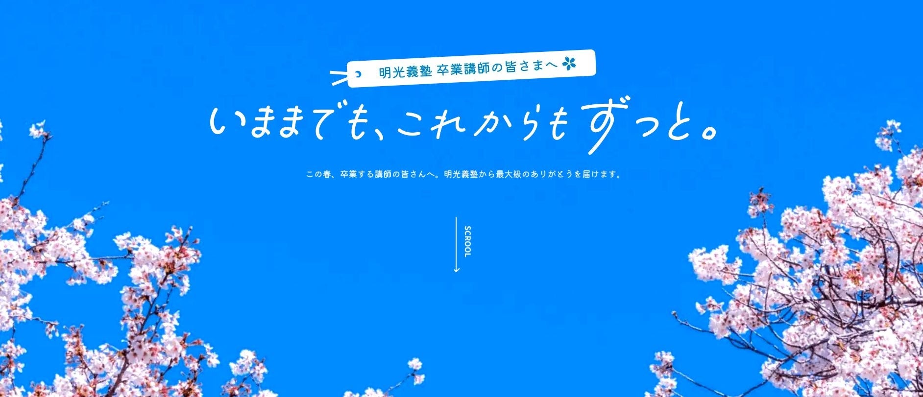 この春、卒業する講師の皆さまへ。最大級のありがとうを届けたい 明光義塾、感謝の気持ちを込めた特設サイトをオープン 卒業講師・現役講師のキャリア支援を目的とした「明光義塾アルムナイ」について