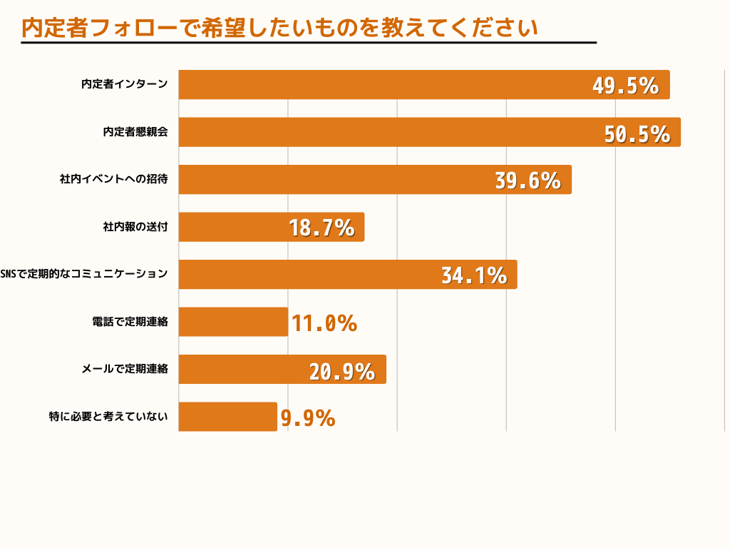 - 内定者フォローで学生が望むもので最多は「懇親会」