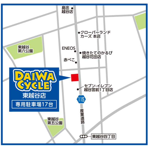 ダイワサイクル東越谷店は東武スカイツリーライン 北越谷駅から東に車で約5分に位置します。店舗周辺には公園が多く、学校やスーパーなどがあり、通勤通学やお出かけ途中の空気入れ・お困りごとなどでも気軽にお立ち寄りいただきやすい立地です。また、県道115号線に面し、17台の専用駐車場を備えており、お車でもお越しいただきやすい店舗です。