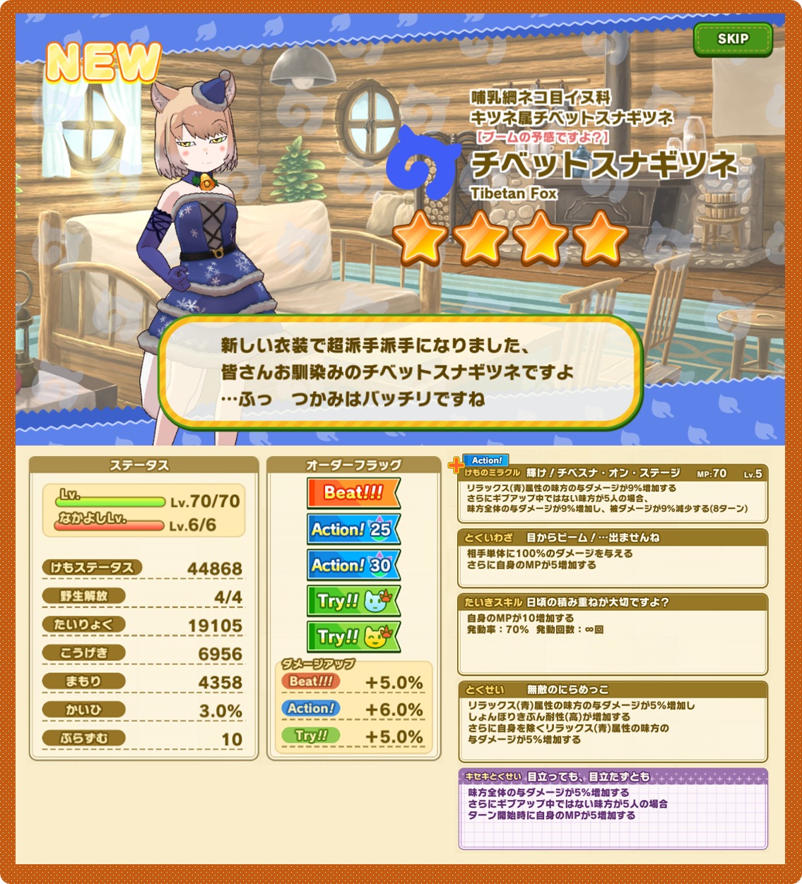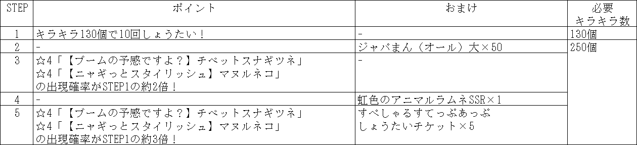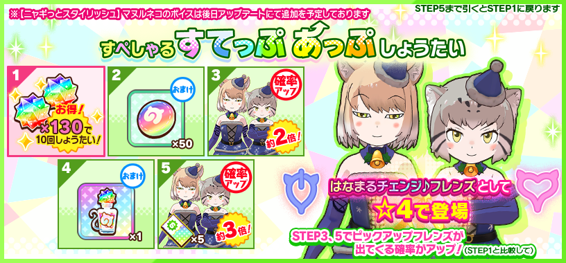 STEP3とSTEP5では☆4「【ブームの予感ですよ?】チベットスナギツネ」、☆4「【ニャギっとスタイリッシュ】マヌルネコ」の出現確率がアップします。