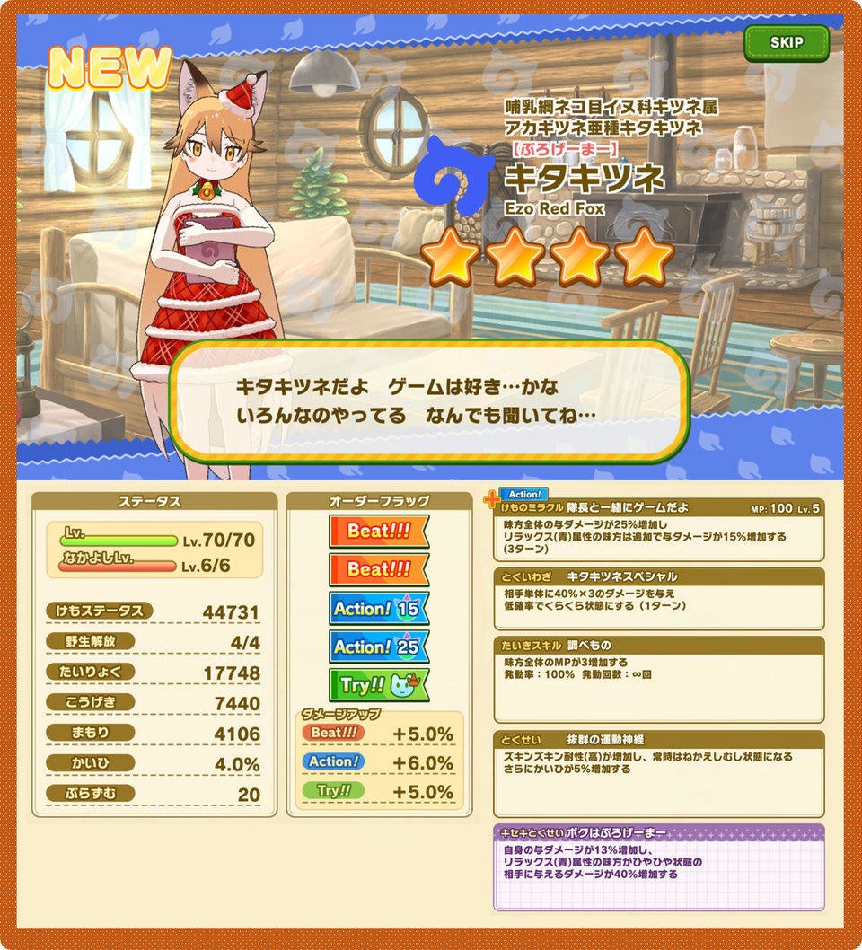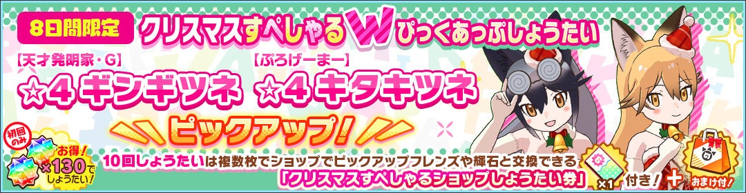 また「10回しょうたい」するごとに、「クリスマスすぺしゃるショップしょうたい券」×1に加え、ジャパまん(オール)大、あるいはキラキラ(無償)が獲得できる「クリスマスらっきーボックス」がもらえます。「クリスマスすぺしゃるショップしょうたい券」を一定数集めると、「クリスマスすぺしゃるショップしょうたい」で☆4「【ぷろげーまー】キタキツネ」、☆4「【天才発明家・G】ギンギツネ」や、☆3フォト【ゆきやコンコン】と交換することができます。