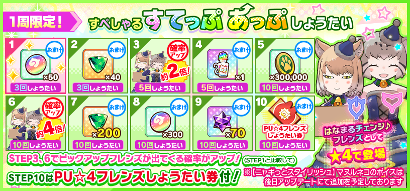 STEP1~4までは「3回しょうたい」や「5回しょうたい」のお手軽しょうたいが可能です。さらに、STEP3とSTEP6では、☆4「【ブームの予感ですよ?】チベットスナギツネ」、☆4「【ニャギっとスタイリッシュ】マヌルネコ」の出現確率がアップします。
