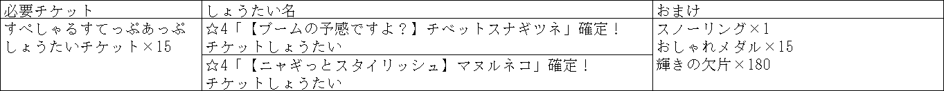 また、「すぺしゃるすてっぷあっぷしょうたいチケット」15枚でできる「☆4【ブームの予感ですよ?】チベットスナギツネ確定!チケットしょうたい」、「☆4【ニャギっとスタイリッシュ】マヌルネコ確定!チケットしょうたい」では、しょうたいのおまけとして、おしゃれメダル×15、輝きの欠片×180、おしゃれアクセ「スノーリング」×1が手に入ります。この機会をお見逃しなく!