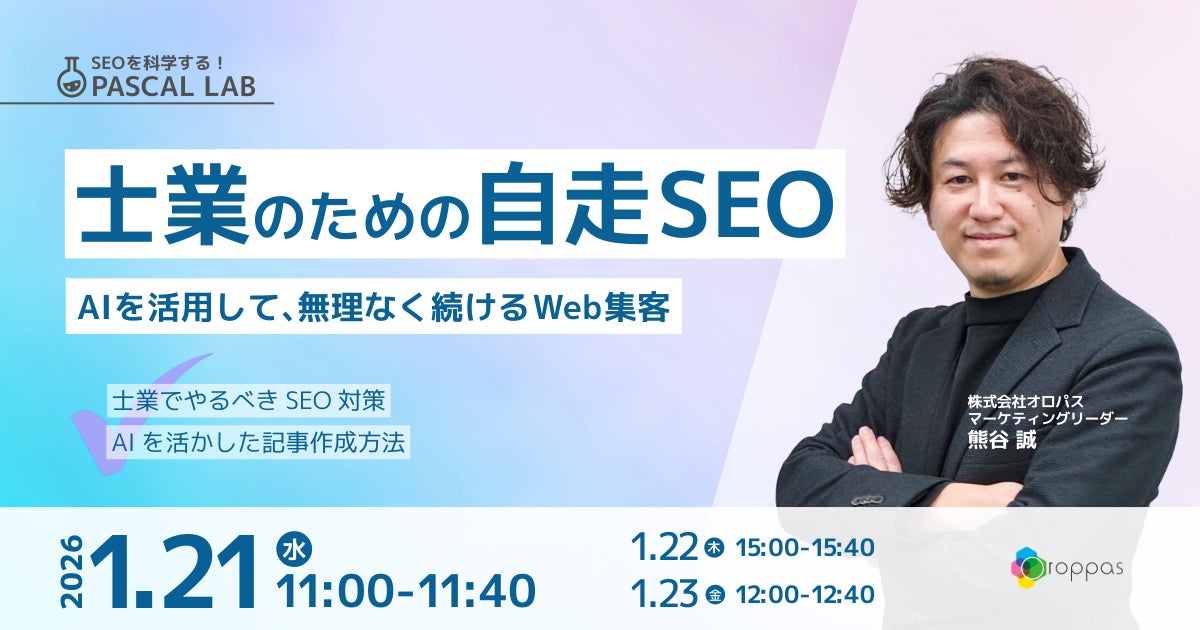 SEOツール「パスカル」の開発・提供を行う株式会社オロパスは、2026年1月21日(水)に、士業の方向けにAIを活用してSEOを自走できるようになるためのウェビナーを開催いたします。